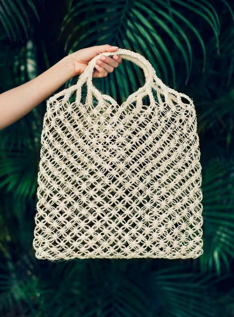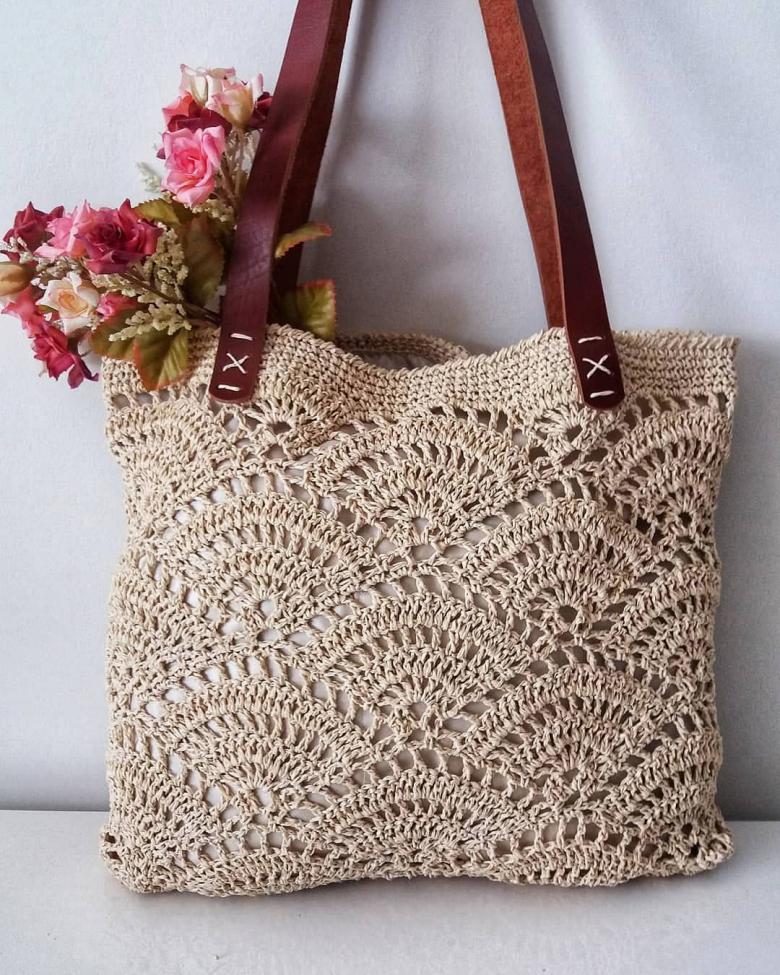 Choisissez un fil de coton pour le crochet, choisissez un schéma simple et tricotez un tissu rectangulaire. Vous cousez les coutures latérales, utilisez de grands anneaux à la place des poignées et faites du crochet. Rien de compliqué et la beauté est indescriptible.