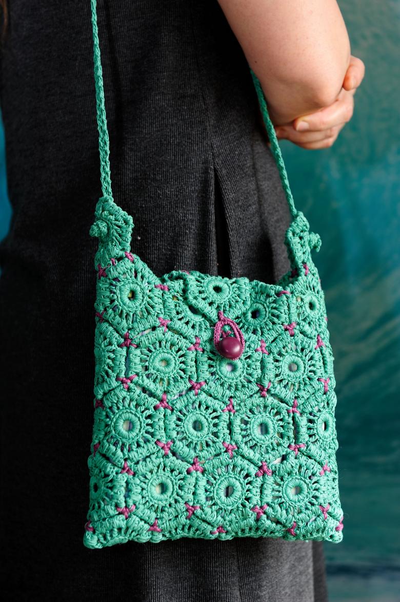 - Crochet - utilisez ce dispositif simple pour créer des formes et des motifs originaux pour un accessoire. Une caractéristique distinctive est que l'étoffe est tricotée comme un tout, sans couture. Les pampilles, les pompons, les rubans et les boutons en bois peuvent être utilisés pour décorer votre sac à main.