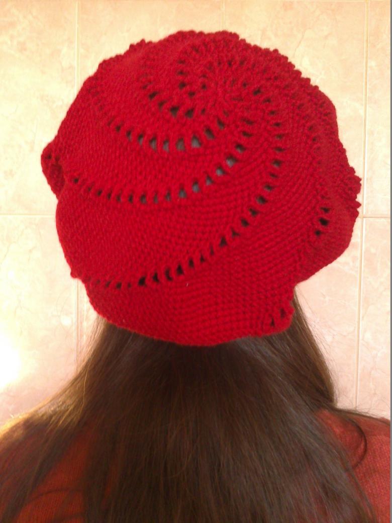 Le motif ressemble à de petites bobines en raison de l'alternance des boutonnières avant et arrière en quinconce. Lorsque vous aurez atteint une hauteur de 22-23 centimètres, vous devrez tricoter pour faire une couronne. Les points de suture seront réduits de 28-30 points, de façon régulière. Vous obtiendrez ainsi 90 à 100 points de suture par rang.