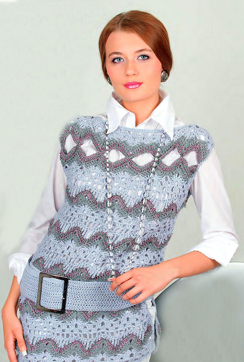 Nous vous recommandons d'utiliser une ceinture avec cette veste sans manches. Et tricotez-le plus longtemps, car la matière duveteuse est toujours visuellement repulpante.