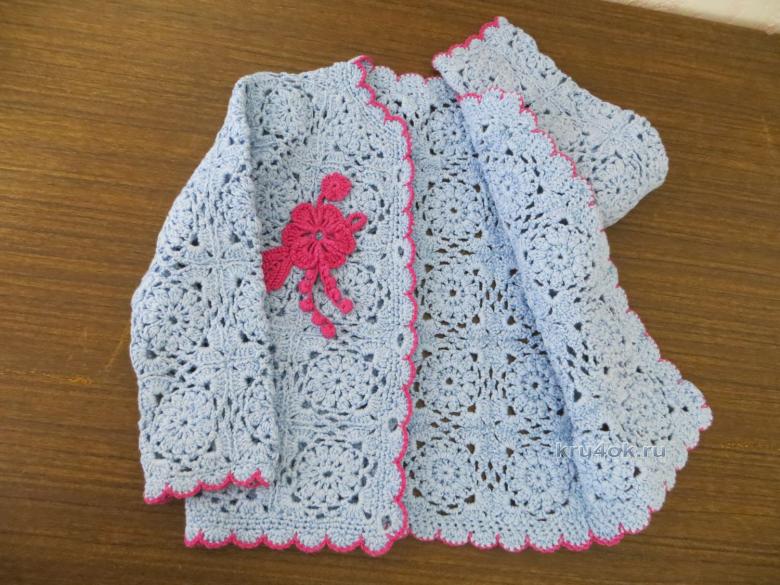 Un tissu solide avec des demi-points est l'option la plus pratique. Sur la tablette avant et les bords de la veste peuvent courir une bordure ou un motif simple. Dans tous les cas, les tricots sont portés sur un gilet, et les culottes - sur une grenouillère.