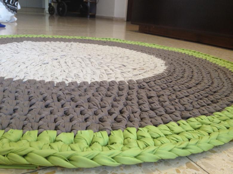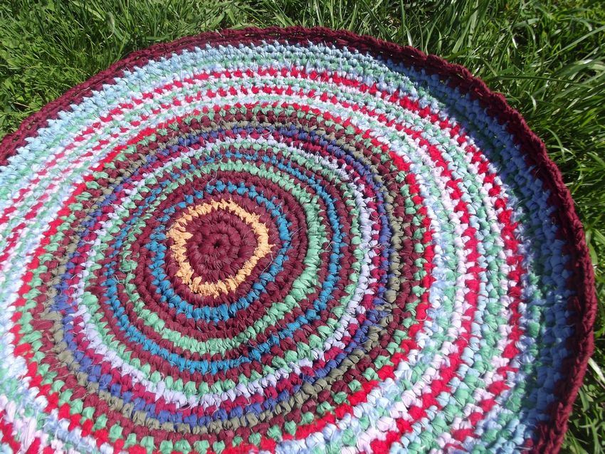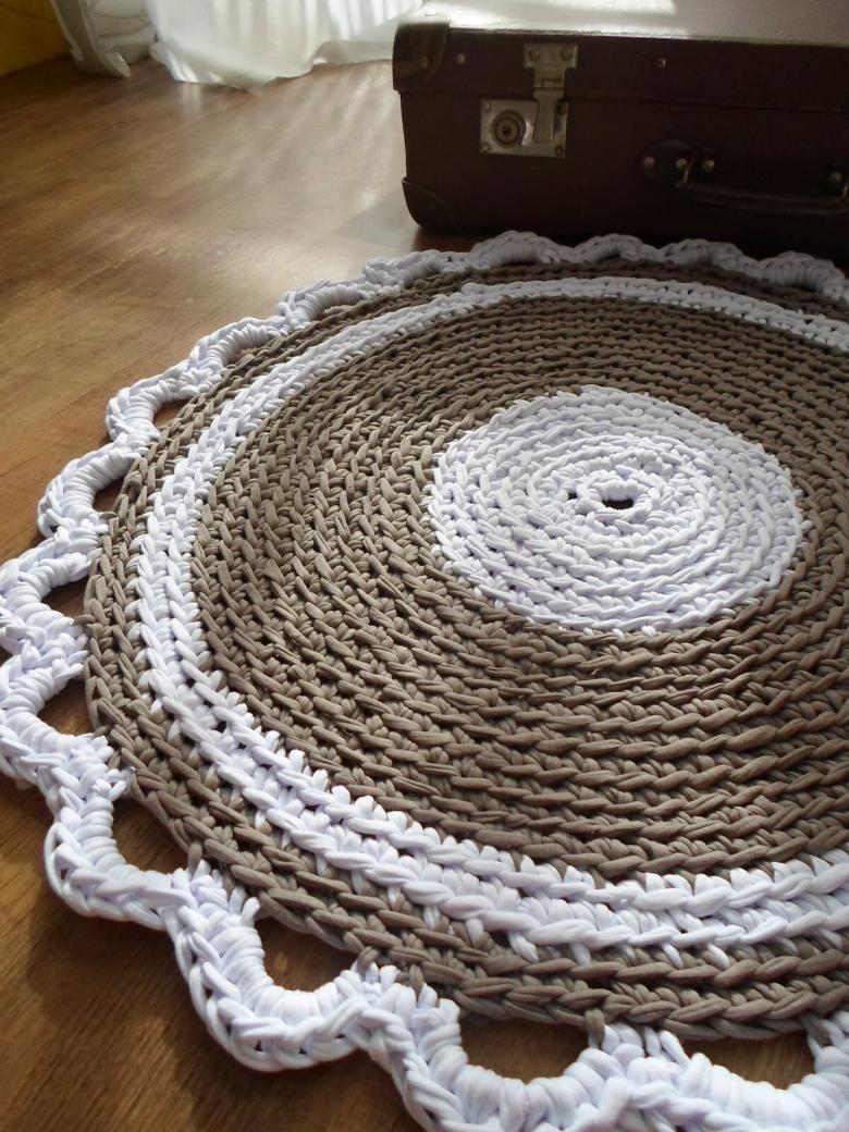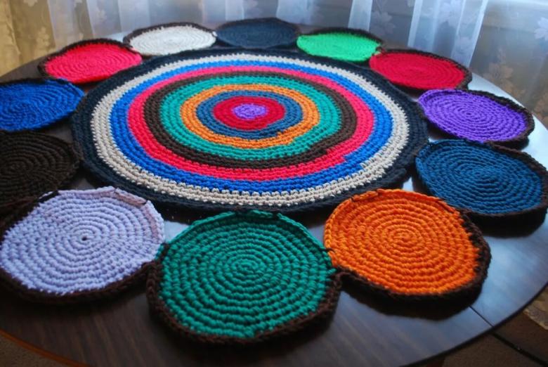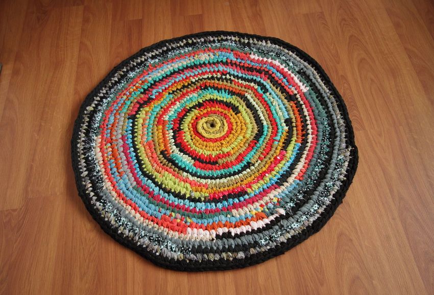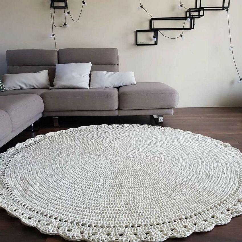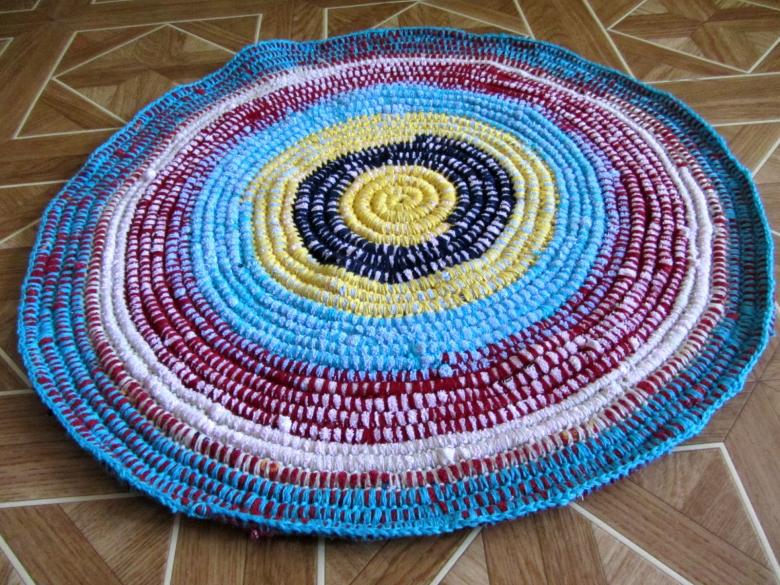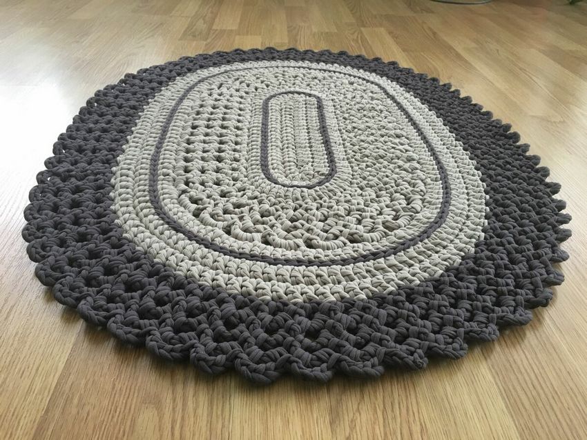 - Un seul fil. Ce tapis est tricoté avec un seul fil, le travail commence au centre et va vers les bords. Il se transforme en une toile solide.