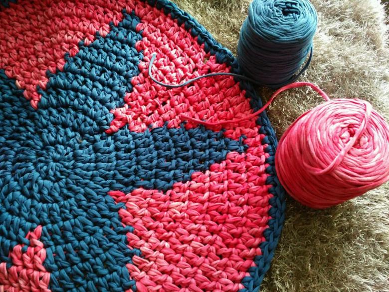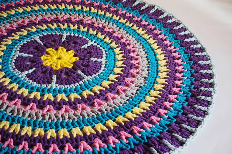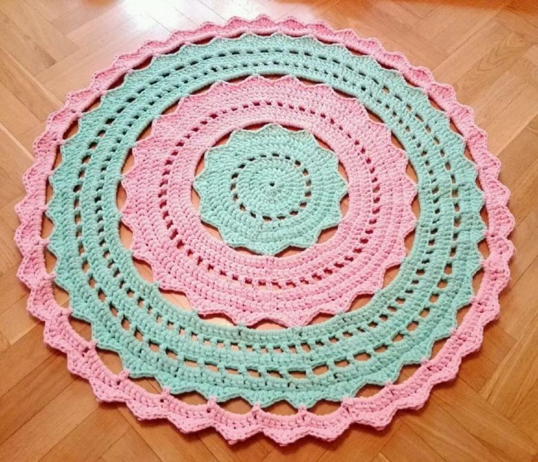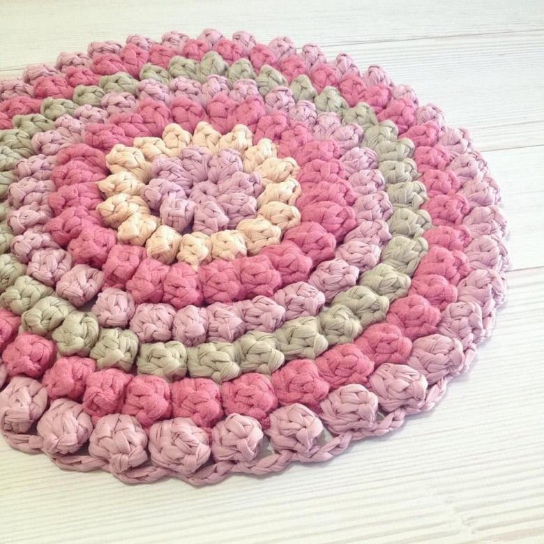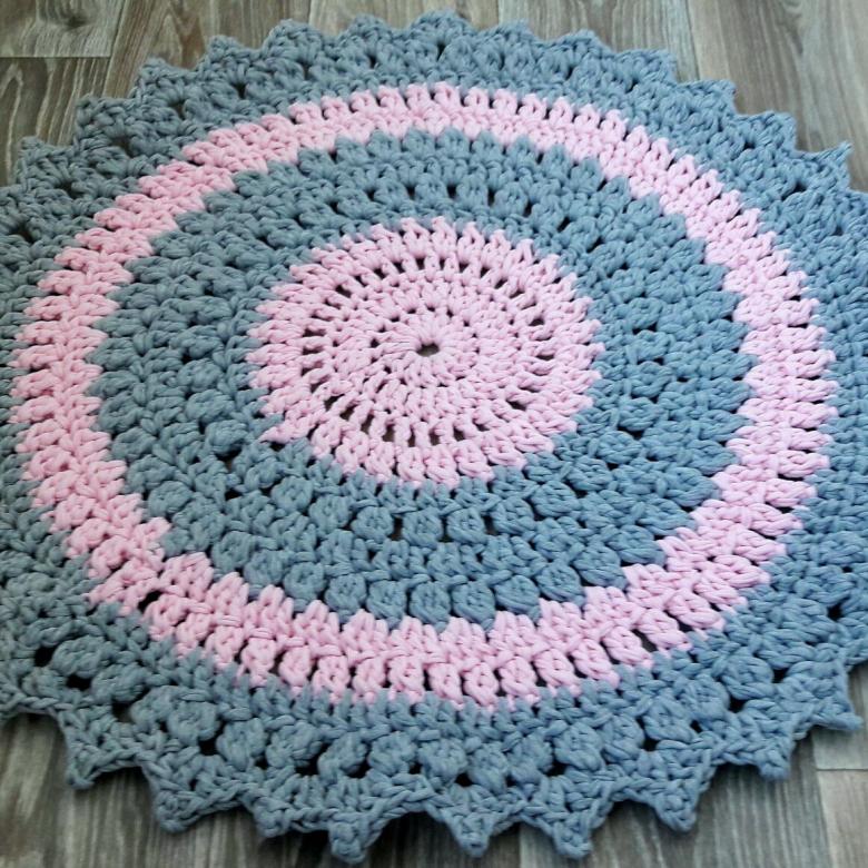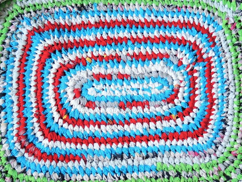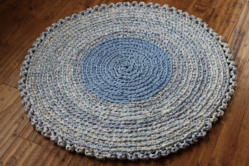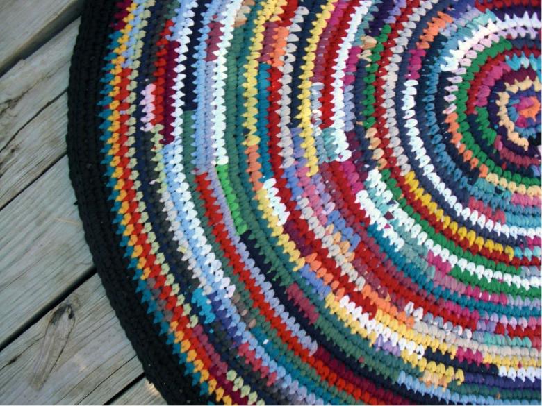 - Un seul fil. Ce tapis est tricoté avec un seul fil, le travail commence au centre et va vers les bords. Il se transforme en une toile solide.