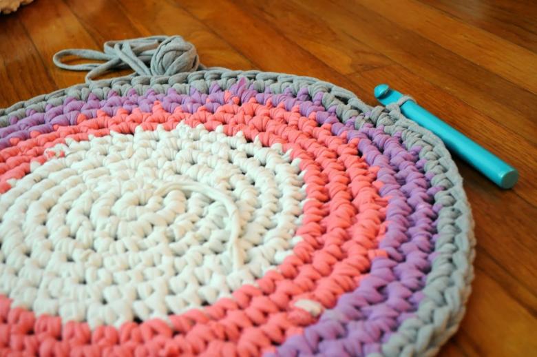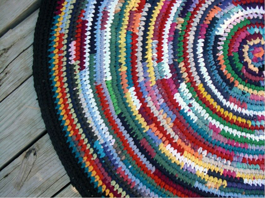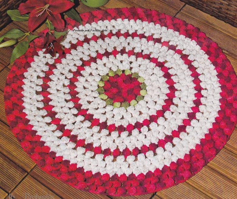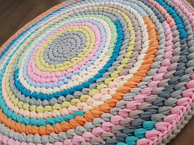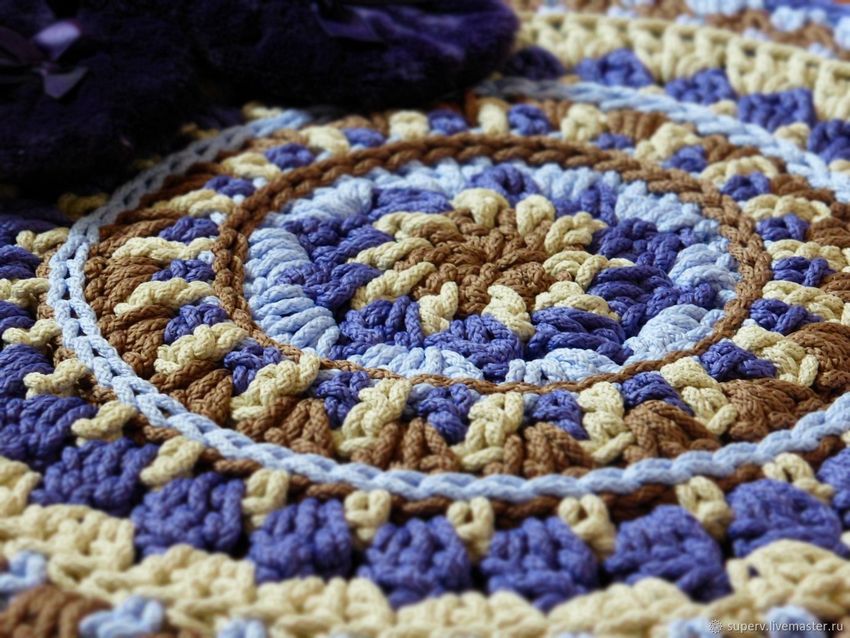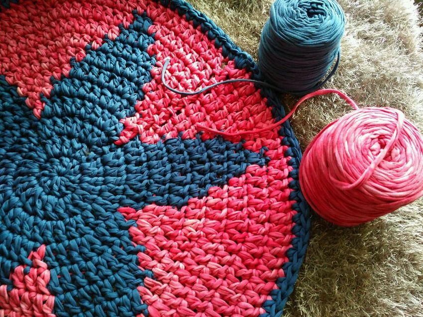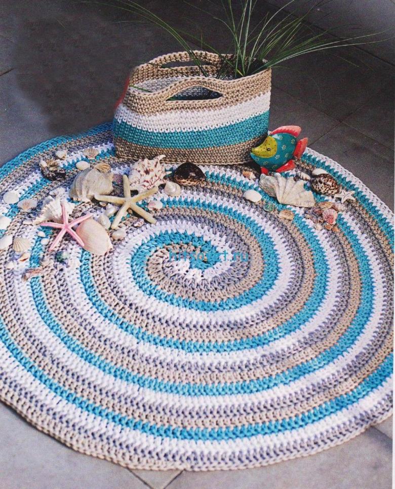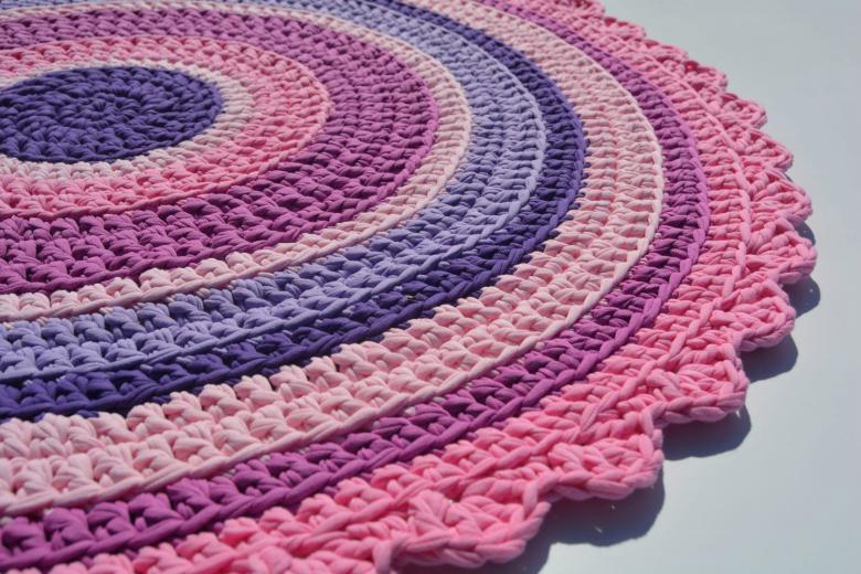 - Un seul fil. Ce tapis est tricoté avec un seul fil, le travail commence au centre et va vers les bords. Il se transforme en une toile solide.