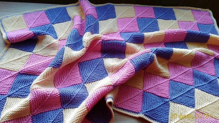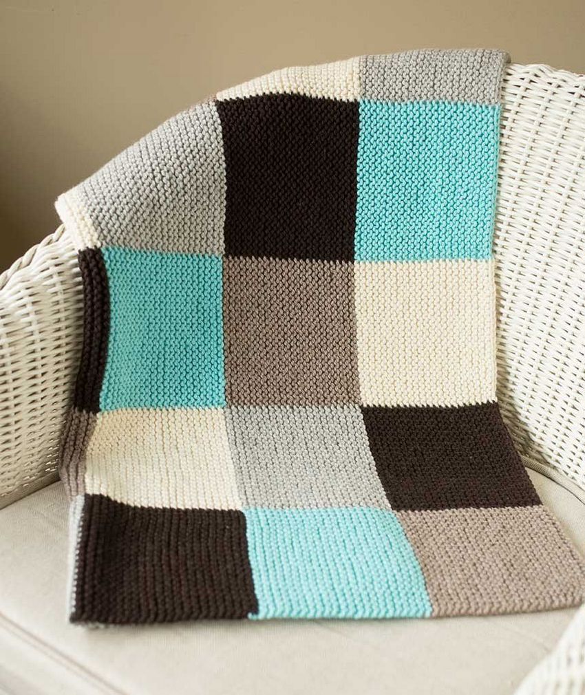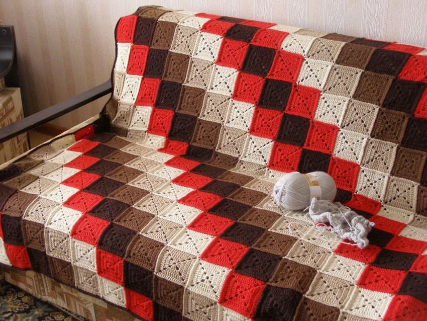 Les femmes débutantes choisissent plus souvent cette façon de tricoter des plaids. Chaque carré est tricoté séparément, puis toutes les pièces sont assemblées. Vous pouvez réaliser chaque pièce avec un motif individuel ou des couleurs différentes.
