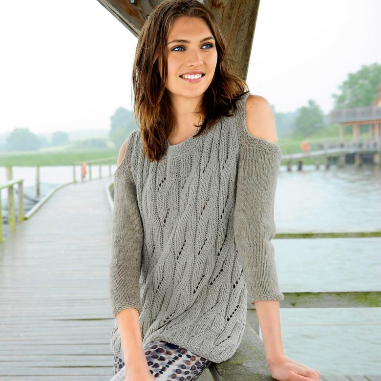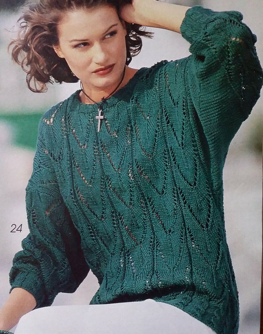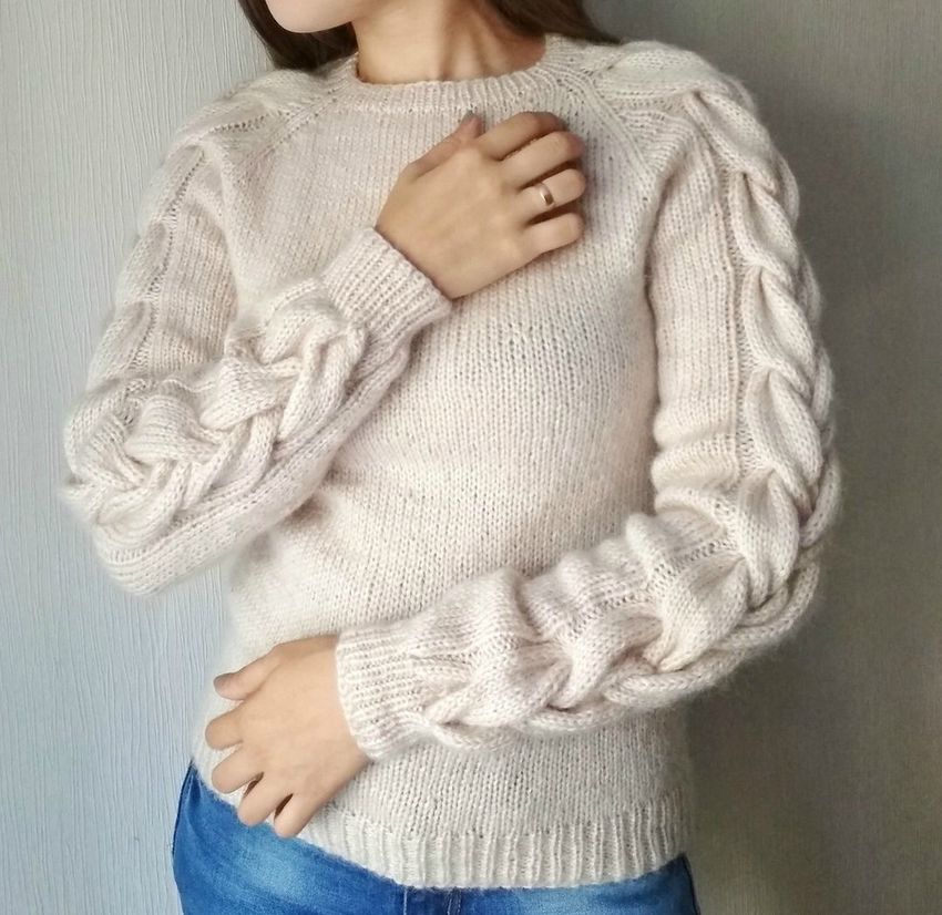 Tricotage simple des manches, en commençant par un élastique. Ajoutez progressivement des boucles à partir des bords, tous les 6-10 rangs environ. Fermez la manche simplement en ligne droite. La manche pendra de l'épaule.