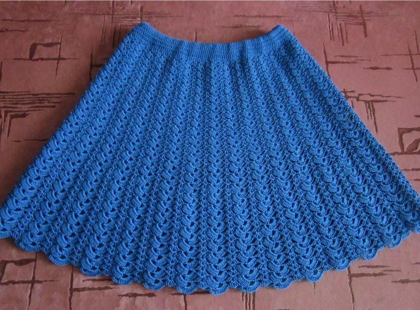 - Lorsque vous avez terminé votre travail, vous devez fermer toutes les coutures, plier la ceinture et insérer l'élastique. L'ourlet de la jupe sera crocheté avec un seul rang sans points (vous pouvez utiliser un fil de couleur contrastée) - cela donnera à l'ourlet de la jupe un aspect net et brillant.