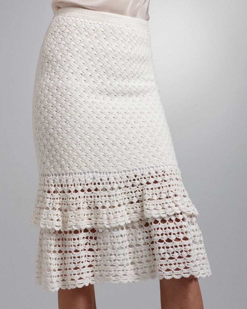 Pour un embellissement supplémentaire, des bandes de tresses peuvent être insérées sur les côtés de la jupe. Vous pouvez utiliser des fils de différentes couleurs pour les réaliser. En plus d'être décoratives, les bandes sont pratiques et aident à maintenir la forme de la jupe pendant longtemps. Le bas du modèle droit peut être décoré d'un motif ajouré au crochet - une telle version ne sera certainement pas ennuyeuse.