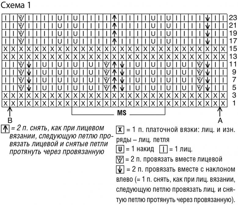 Le diagramme est représenté par des symboles. Dans ce cas, le point avant est représenté par un tiret vertical dans un carré, où un carré est une seule rangée. Le diagramme montre le processus de tricotage de bas en haut (du premier rang au dernier rang).
