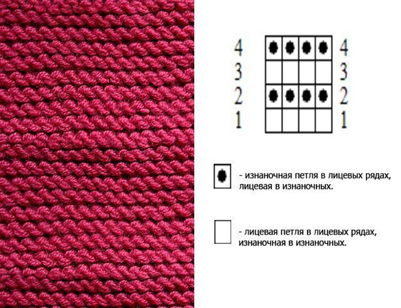 Le schéma de ce type de tricot est très simple et accessible aux débutants. Chaque rang (abrégé en P dans le modèle) est tricoté avec un type de point (P - stitch). Il est important de coudre avec un seul type de point - soit le point arrière, soit le point avant.