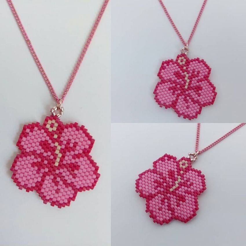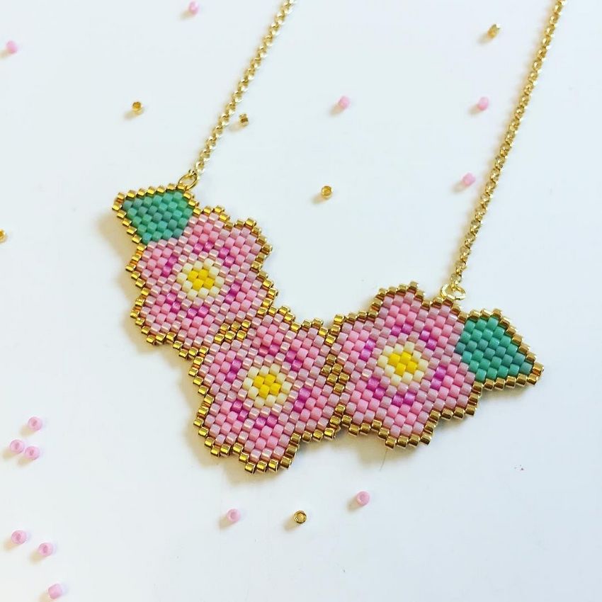 - Enfilez les deux premières perles du rang suivant et faites-les passer dans la boucle formée entre la première et la deuxième perle du rang précédent.