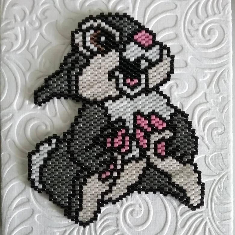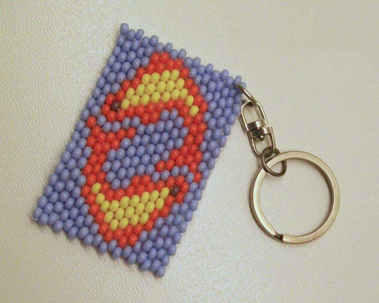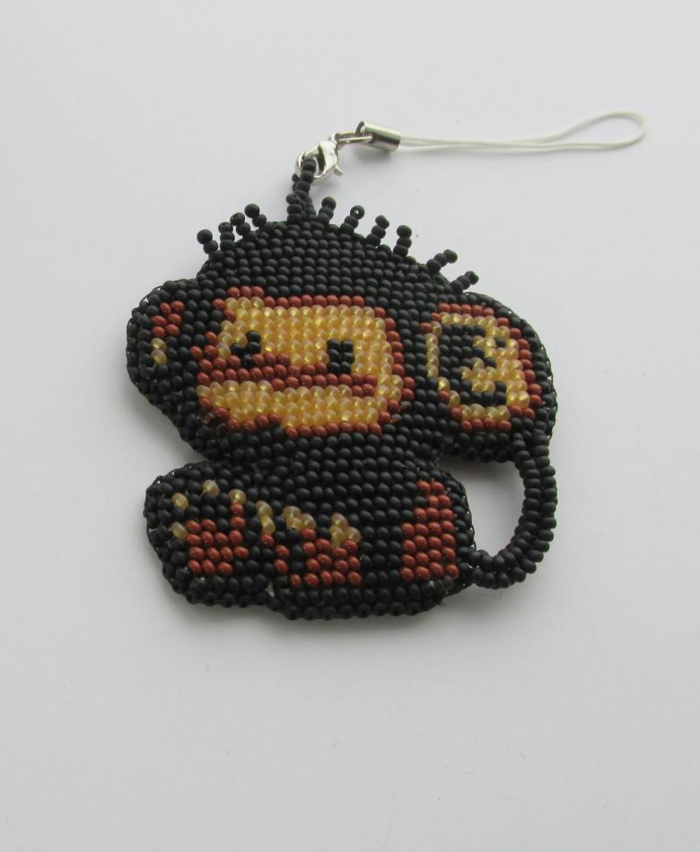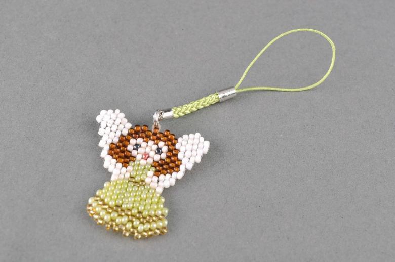 - La première rangée du porte-clés est sautée, le tissage commence avec la deuxième rangée. À l'aide d'une aiguille, une perle noire est enfilée sur le fil.