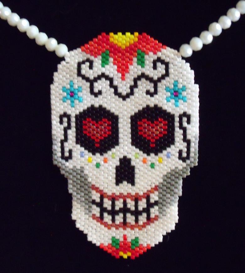 - Une boucle est faite, le fil est enfilé dans les perles blanches à la base et ressort au milieu du troisième rang. Le tissage se poursuit ensuite selon le motif.