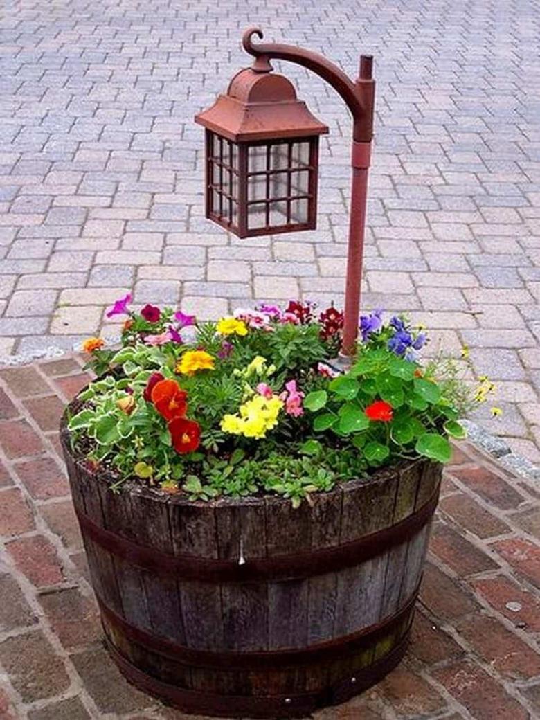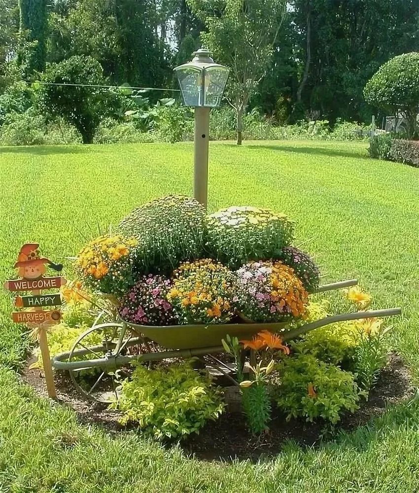 Les valises, les brouettes, les chaises, les pots, les arrosoirs, les bottes de caoutchouc, les bicyclettes et même les baignoires peuvent aussi faire des parterres intéressants. Il suffit de remettre à neuf un vieil objet, d'y poser un film, de le remplir de terre et de planter des fleurs.