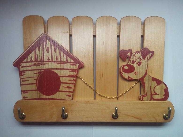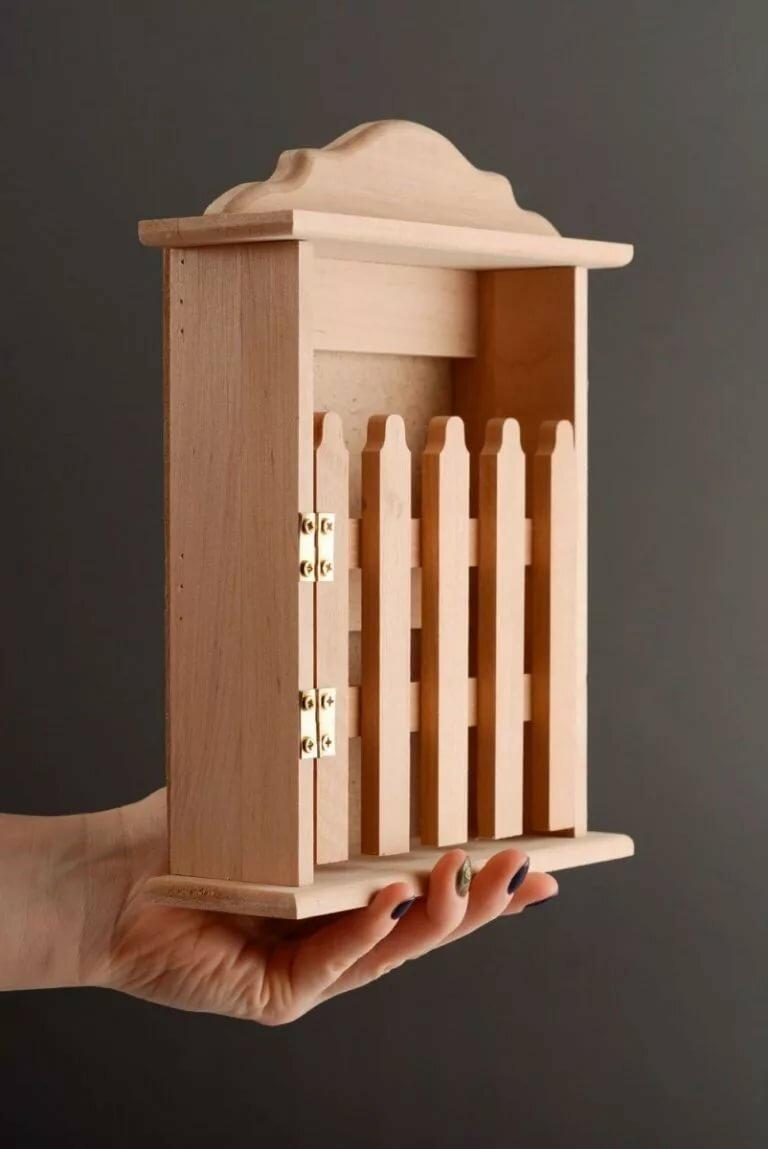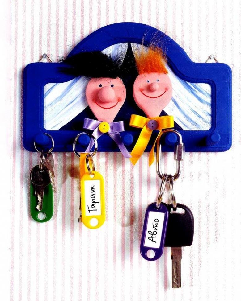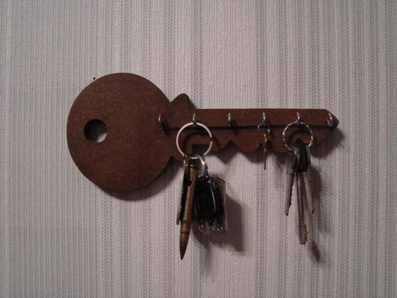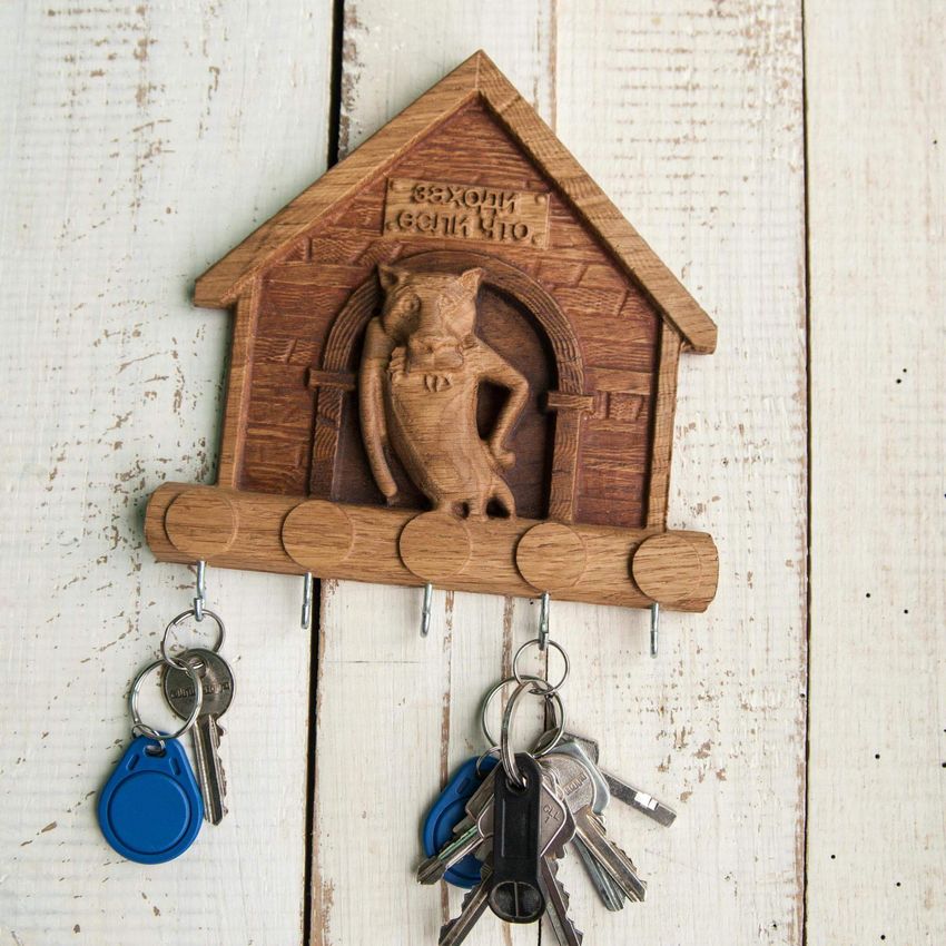 Des coupes spéciales sont effectuées sur la face avant. Toute forme de figurine est montée sur le porte-clés, l'essentiel étant de s'assurer qu'elle ne passe pas par le trou. La figurine est attachée au porte-clés à l'aide d'une corde, qui passe par les entailles dans le trou. La boîte à clés finie doit être poncée et recouverte de vernis ou de peinture.