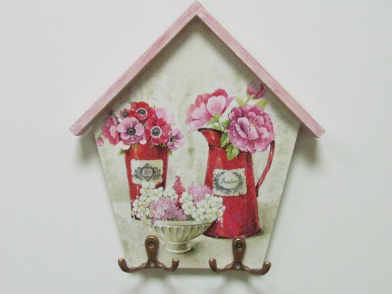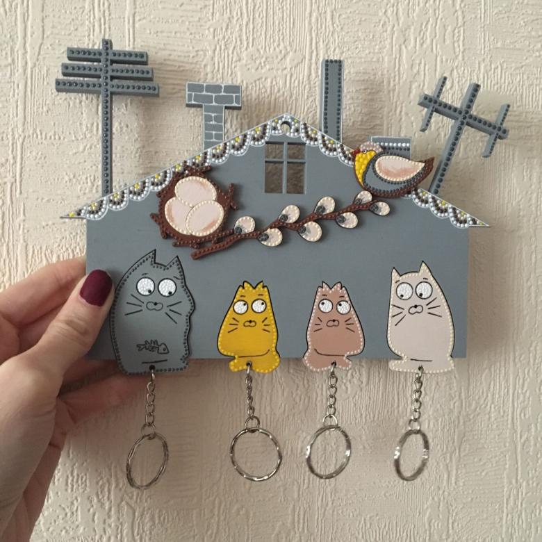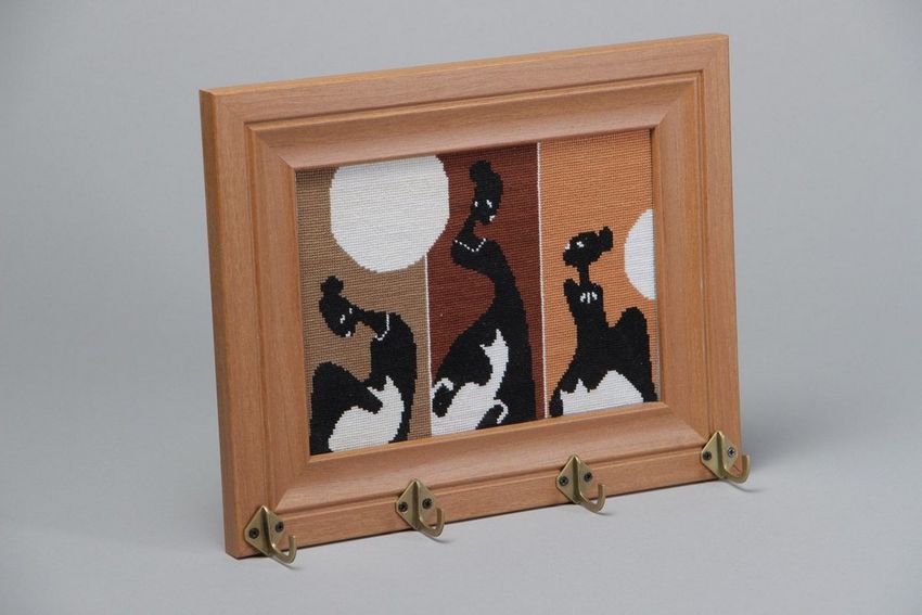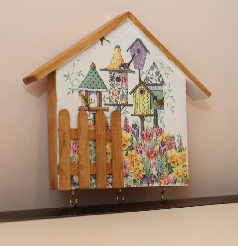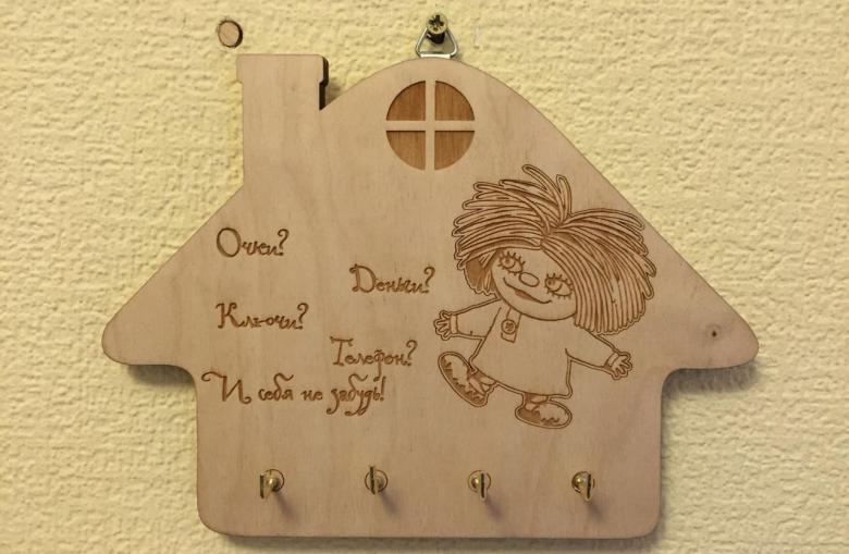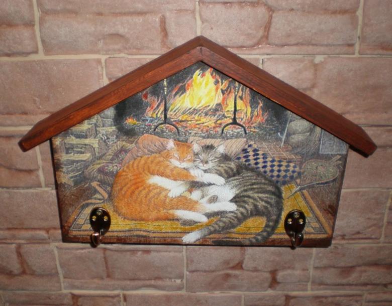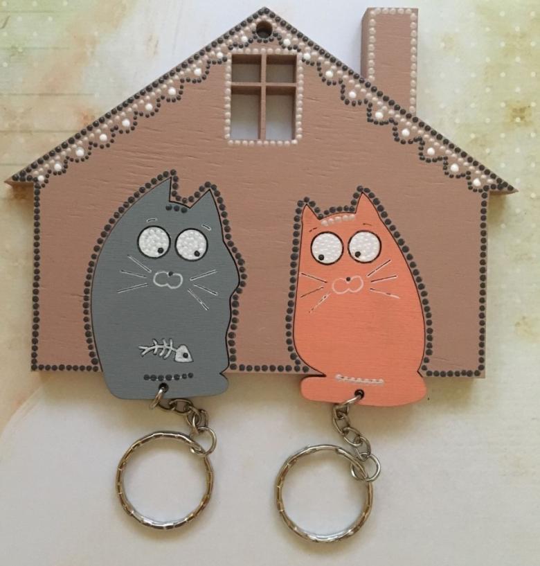 Des coupes spéciales sont effectuées sur la face avant. Toute forme de figurine est montée sur le porte-clés, l'essentiel étant de s'assurer qu'elle ne passe pas par le trou. La figurine est attachée au porte-clés à l'aide d'une corde, qui passe par les entailles dans le trou. La boîte à clés finie doit être poncée et recouverte de vernis ou de peinture.