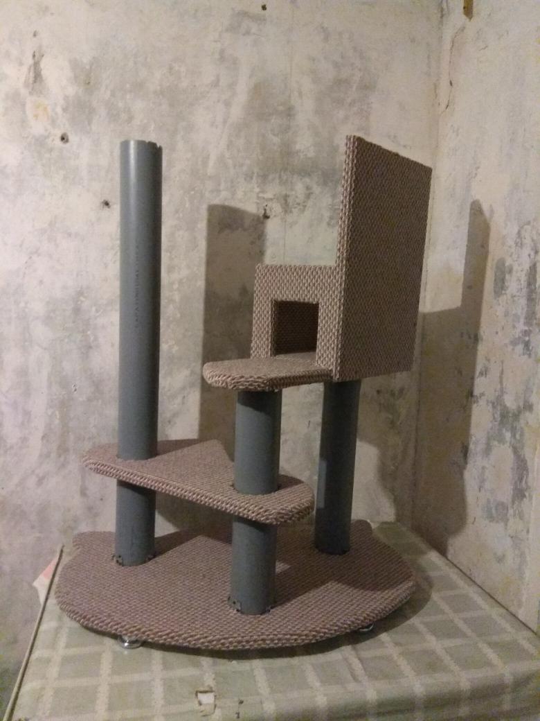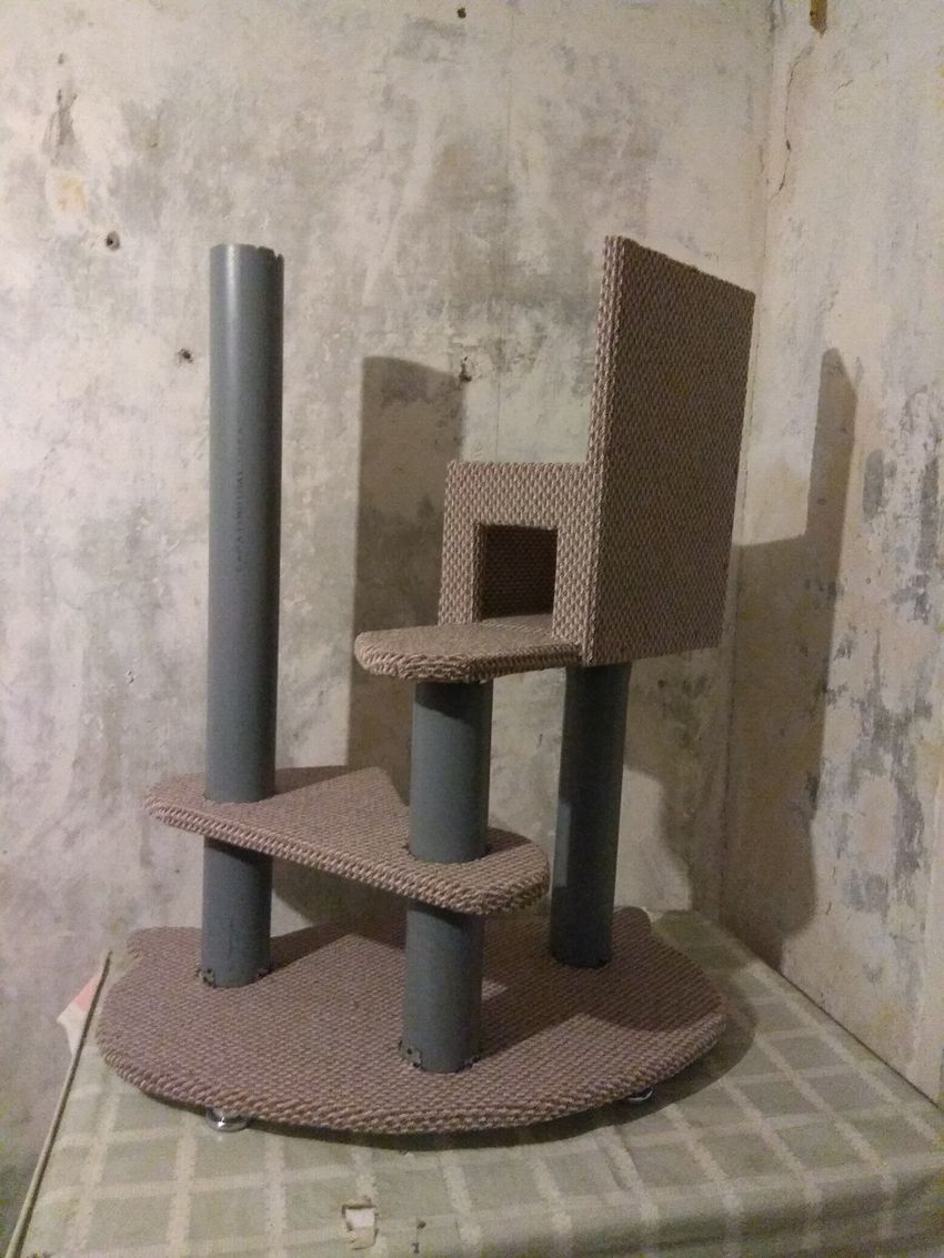 Préparez deux planches de contreplaqué d'au moins 25 cm de large (pour un gros chat, la largeur doit être augmentée). Vous pouvez utiliser de vieux tapis, qui doivent être posés sur le contreplaqué avec la face inférieure vers le haut, comme coussin souple. Il suffit de fixer la moquette avec une agrafeuse. La structure est ensuite fixée au mur et l'unité est prête à être utilisée.