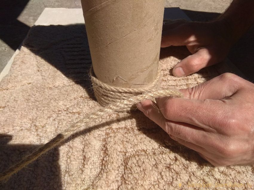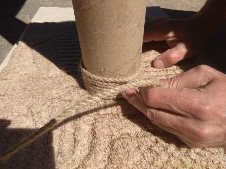 Ce tapis de jeu constitue un lieu de repos pour l'animal. Fabriquez-le à partir d'un tapis, de n'importe quelle fibre naturelle et d'une corde en sisal. Laissez un espace au centre du tapis pour un aiguiseur de griffes, et couvrez le reste avec une corde de sisal. Les bords doivent également être collés pour empêcher votre animal de tirer sur les ficelles.