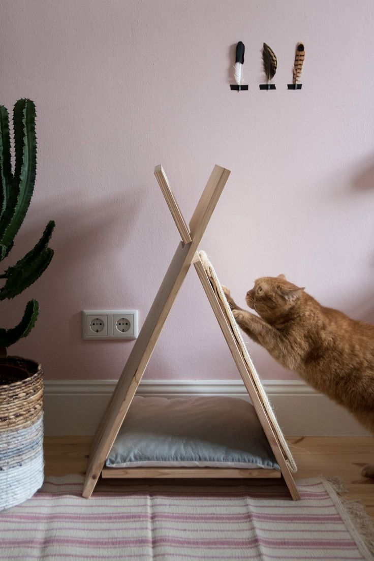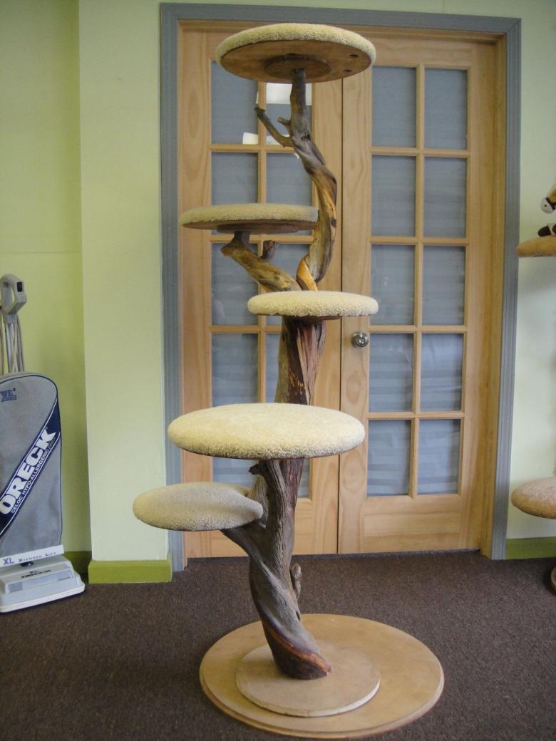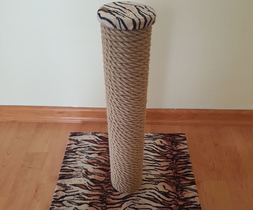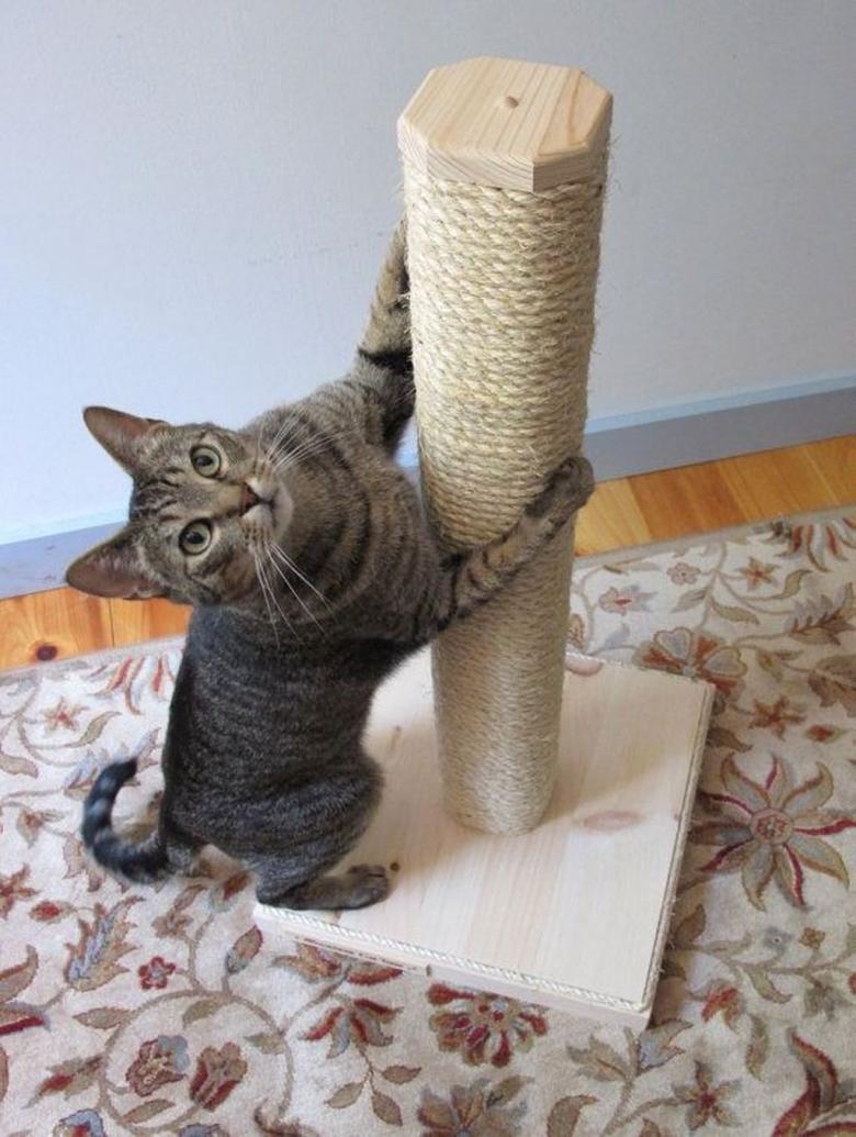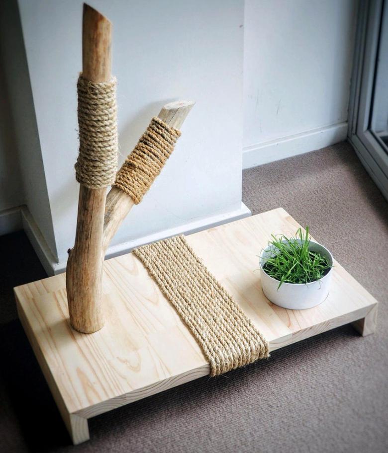 Un griffoir en bois est une excellente alternative aux accessoires du magasin. Une bûche taillée dans le sens de la longueur est simplement fixée au mur et enroulée autour d'un vieux tapis ou d'un matelas.