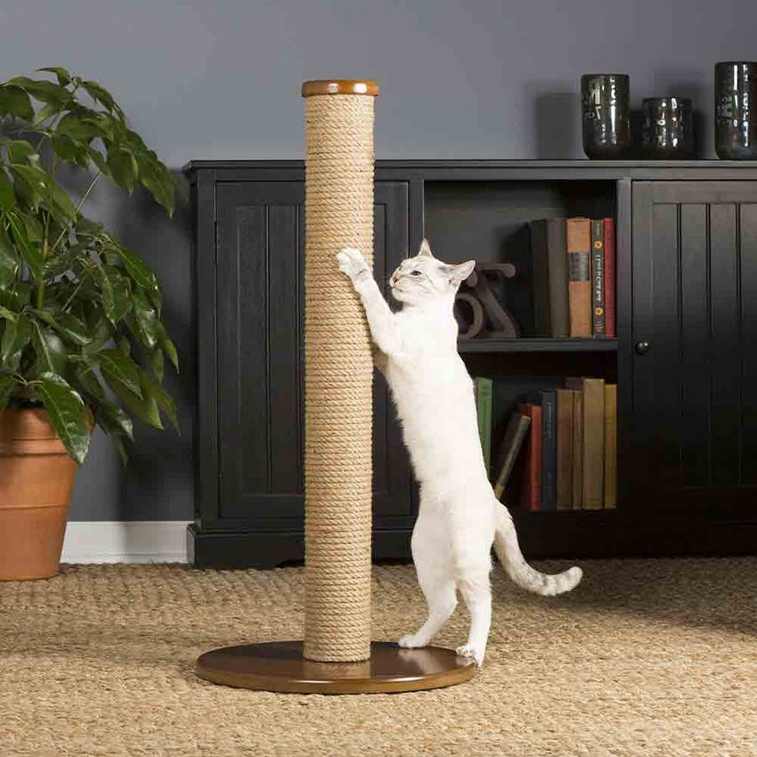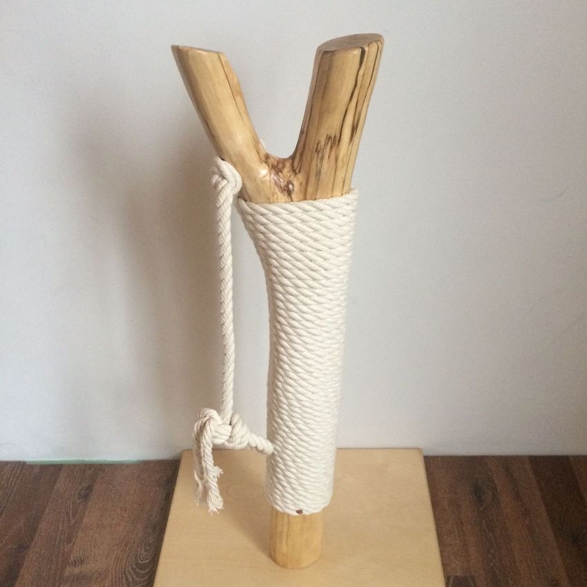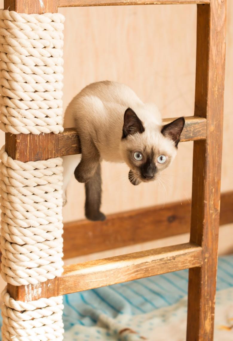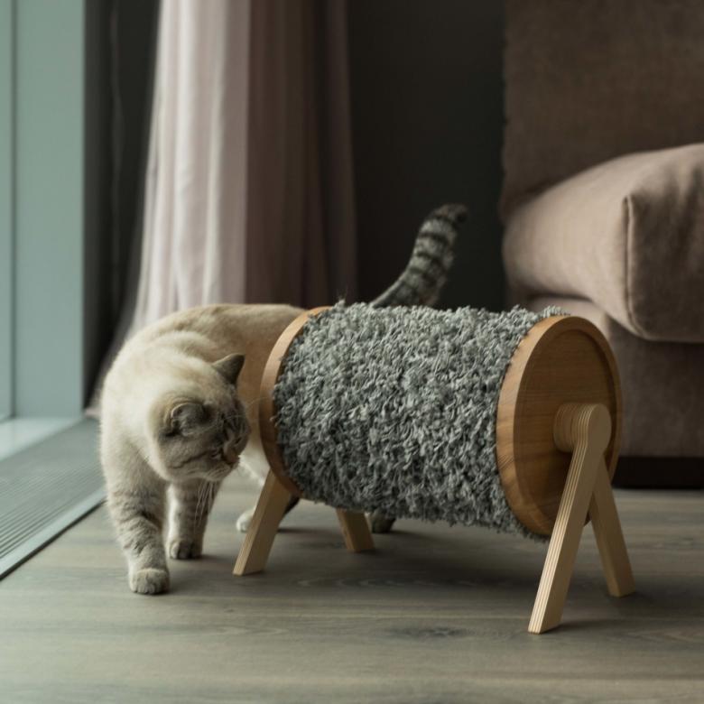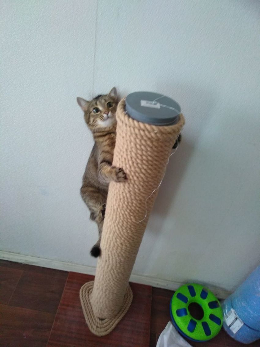 Un griffoir en bois est une excellente alternative aux accessoires du magasin. Une bûche taillée dans le sens de la longueur est simplement fixée au mur et enroulée autour d'un vieux tapis ou d'un matelas.