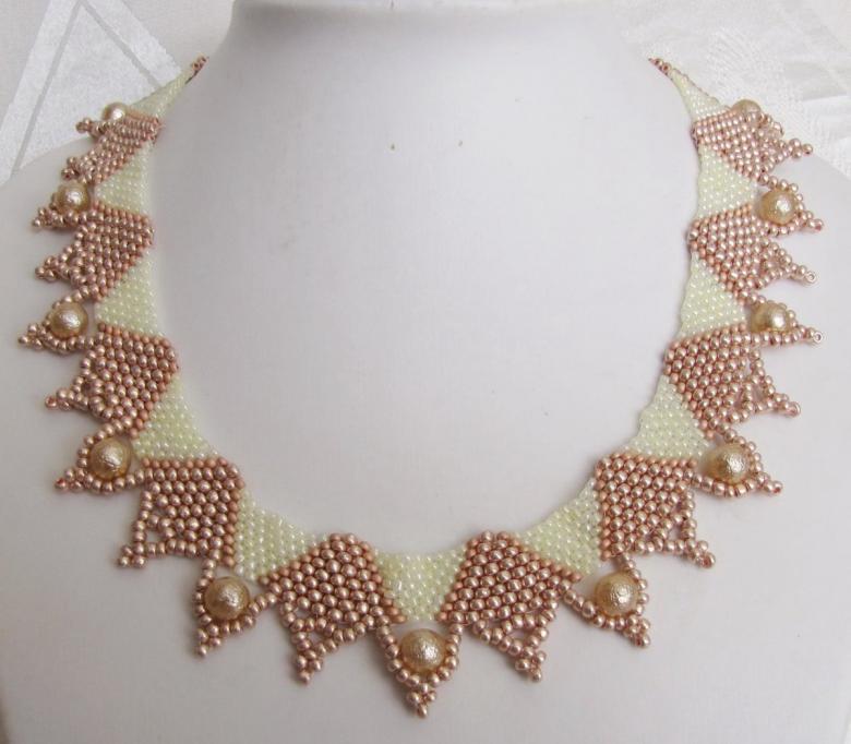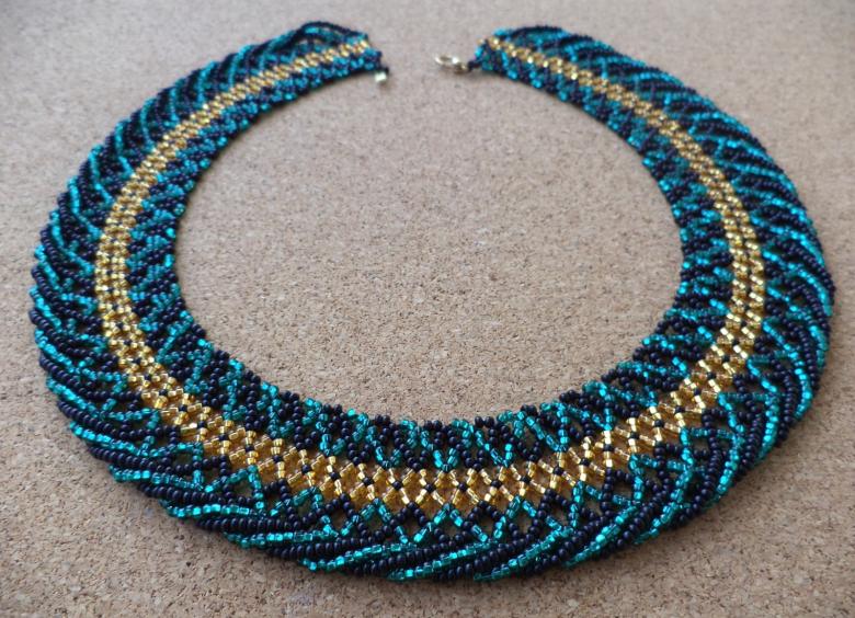 - Trois rangs tressés avec des perles d'or foncé et les quatre suivants avec des perles brunes ;