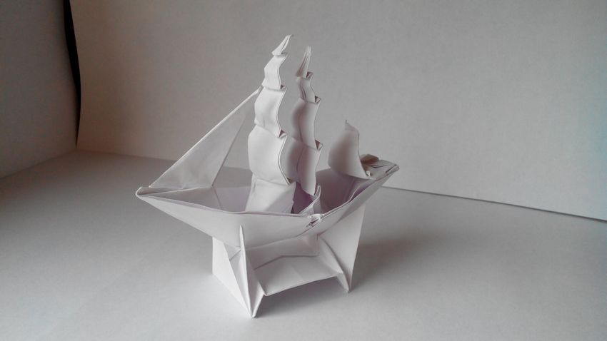 Un bateau intéressant et amusant, adapté à tout type d'embarcation. La forme de base a des mouvements simples. Pour commencer à fabriquer le modèle, choisissez la couleur de la feuille, comme le modèle apparaîtra de face. Le papier brillant, qui " brille " à la lumière, est excellent. On peut aussi utiliser le noir, le brun ou le bleu comme base.