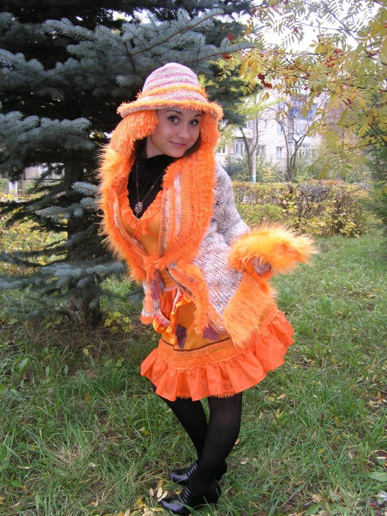 Comme base de l'image, choisissez ce avec quoi vous vous sentez le plus à l'aise pour travailler. Comme nous l'avons déjà mentionné, parfois vous n'avez tout simplement pas le temps de faire un costume de qualité. Dans ce cas, vous pouvez utiliser le vêtement, le chemisier, la jupe d'origine et y faire des éléments d'un patch décoratif ou un patch complet de tissu orange.