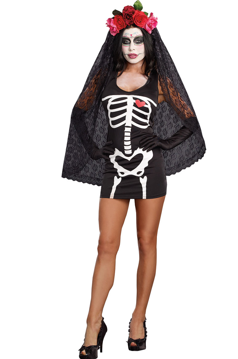 La voyante gitane, reconnaissable à sa jupe colorée, son foulard bouclé et ses nombreux bijoux étincelants, est très demandée. En présence d'une robe de mariée, l'idée d'apparaître comme un cadavre de mariée en blanchissant le visage, en assombrissant le contour des yeux et en marquant le sang à la peinture est née.