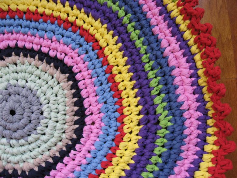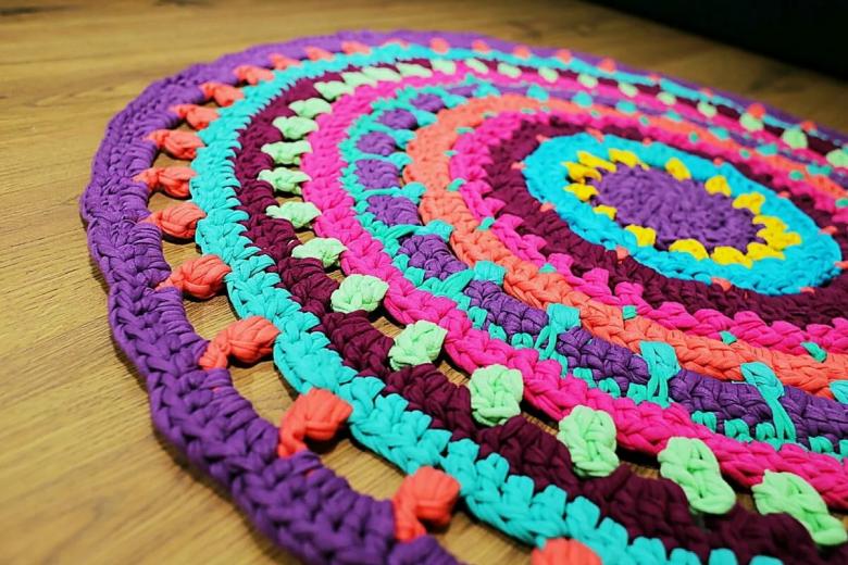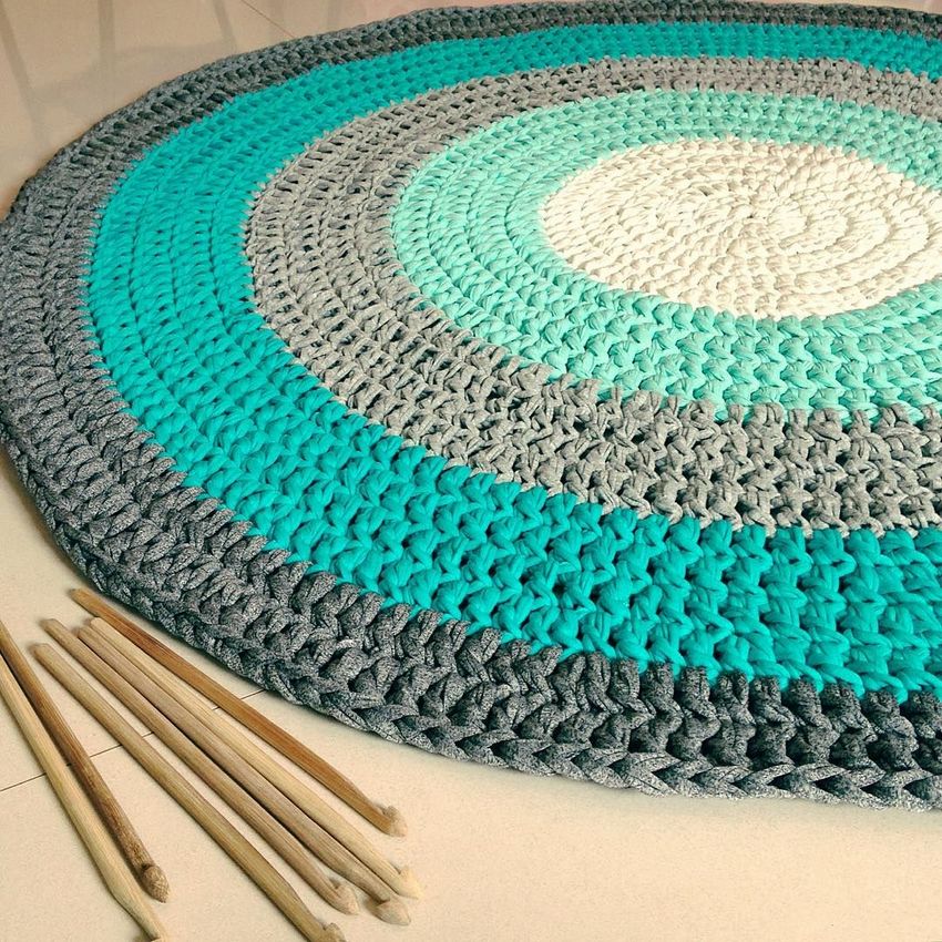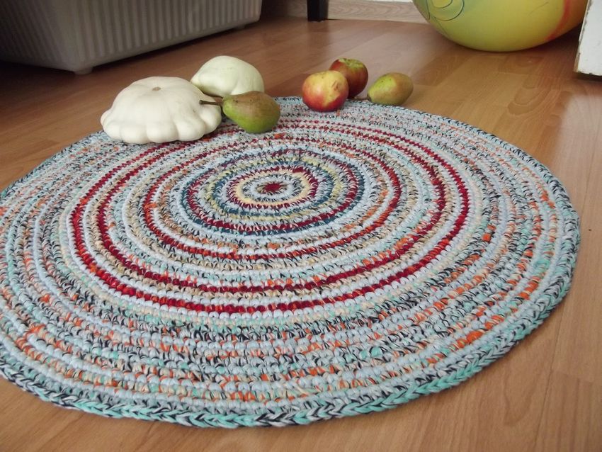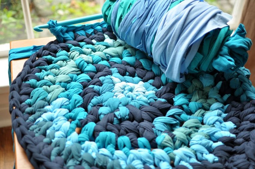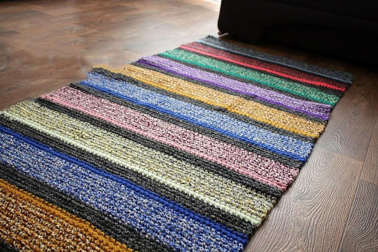 Un tapis intéressant fait de vieux T-shirts peut être réalisé de vos propres mains, sans cours de maître, en utilisant la technique du tricot. Au stade de la préparation, les t-shirts sont coupés en fines bandes (2-3 cm) et tordus en écheveaux. Un tel fil improvisé est tissé comme une serviette, mais il n'utilise pas d'aiguilles.