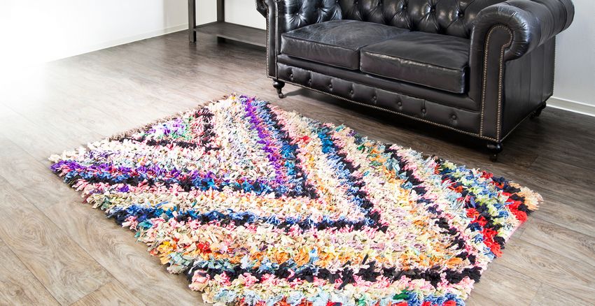 Le denim usagé de différentes couleurs est utilisé pour fabriquer des tapis aux formes et à l'aspect intéressants. Les bandes sont cousues après la formation de la pièce, et peuvent être disposées en brique ou en chevron, en suivant la séquence des couleurs et des nuances, et le vieux denim brillera dans les nouvelles couleurs.