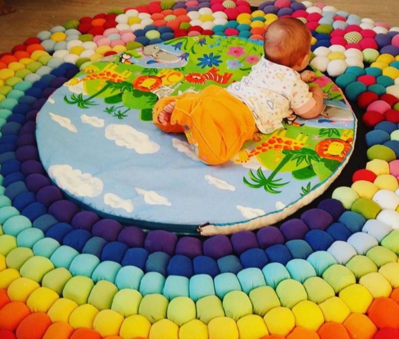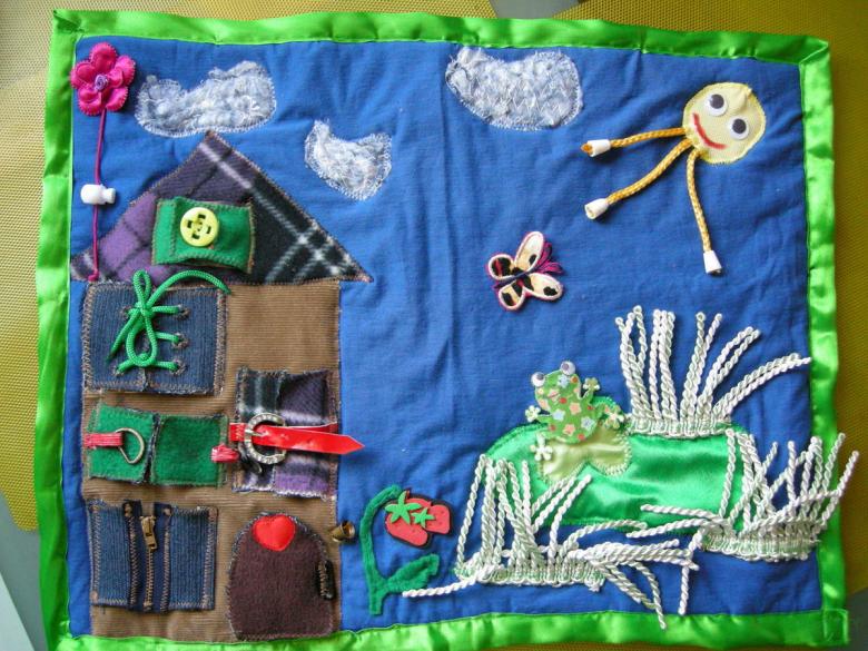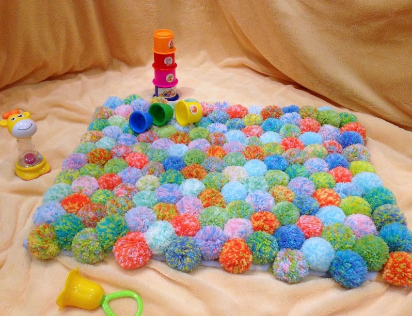 Une solution intéressante consisterait à remplir plusieurs poches du tapis avec des éléments libres de différentes textures (petits et gros grains, haricots et pois, pierres lisses). Dans une zone séparée, des bouchons de bouteilles en plastique colorés, des bandes de fausse fourrure et des pompons en laine sont fixés.