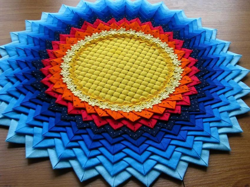 Les matériaux de couleur dense sont parfaits pour la technique du patchwork, auquel cas vous devrez découper une base. Les coins formés à partir des chutes de tissu sont cousus sur la base, en partant des bords du cercle et en utilisant une machine à coudre, la tâche peut être réalisée en 4-5 heures.