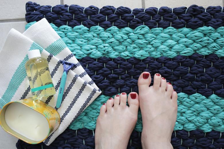 Ou, si vous préférez créer un tapis rayé de sacs poubelle ou de sacs en plastique, vous pouvez placer le tapis devant votre porte.
