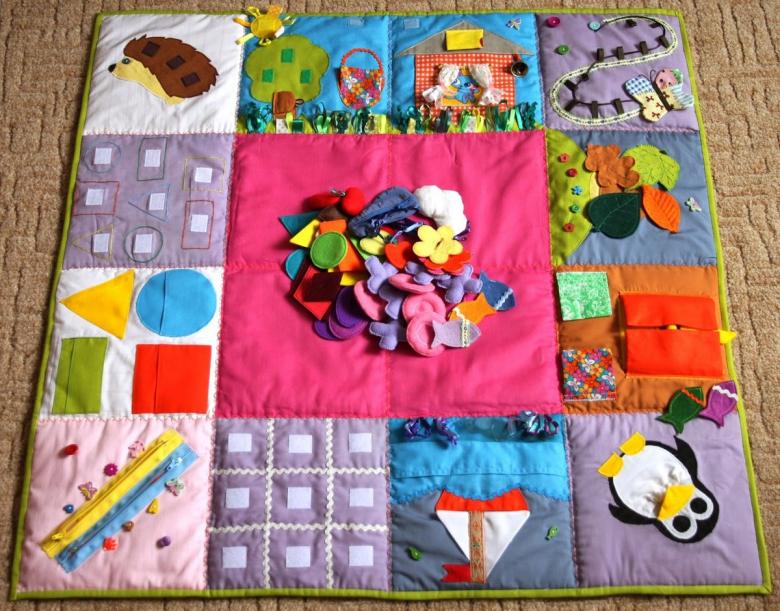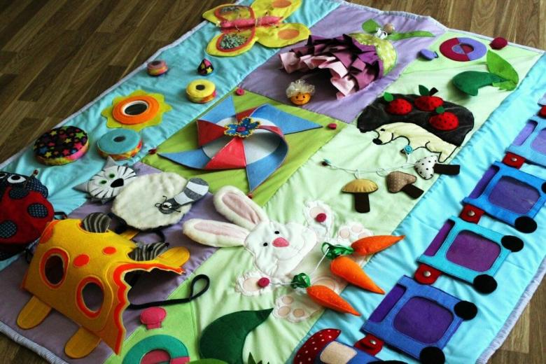 Les jeux actifs et le processus d'apprentissage du bébé peuvent diversifier la forme de jeu, et pour cela utiliser différents jouets. Créer un tapis de développement avec leurs propres mains peut n'importe quel bricoleur, car ce tissu-billet est divisé en plusieurs zones, qui sont décorées avec des éléments différents.