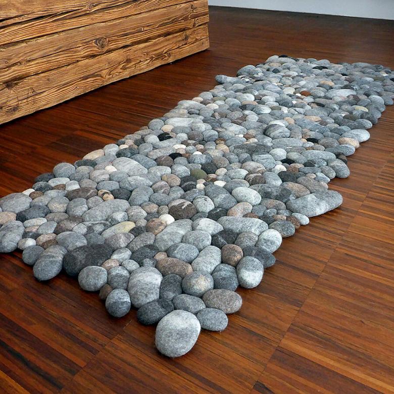 Des "cailloux" aux formes douces et variées sont cousus les uns aux autres pour former un tapis souple ayant l'apparence d'un chemin de pierre.