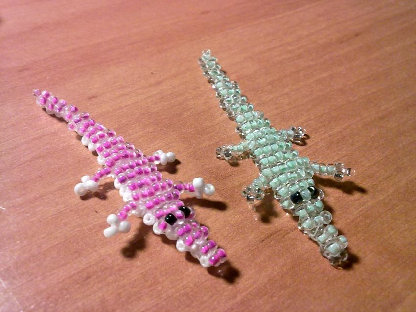 - Des perles en deux couleurs pour créer une authentique peau de reptile. Mais pour une fille, une peau de crocodile entièrement rose peut être tissée. Il peut être de n'importe quelle couleur si vous le souhaitez, tant que la forme est réelle ;