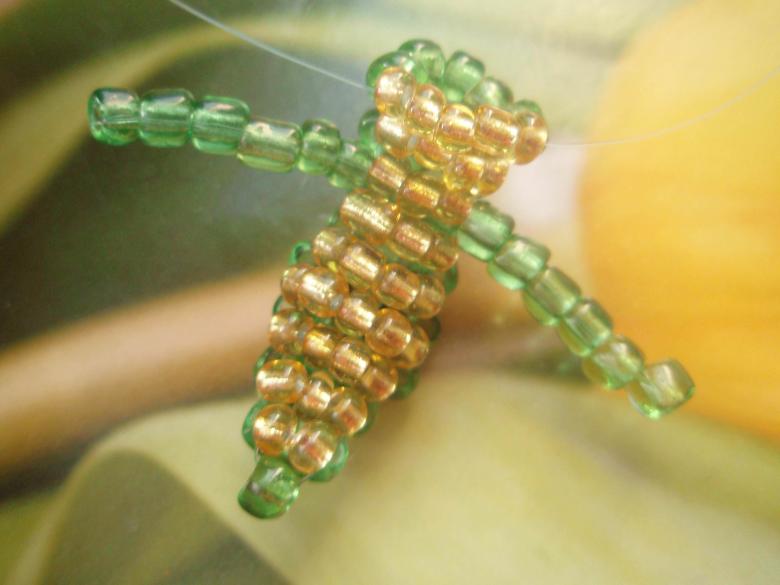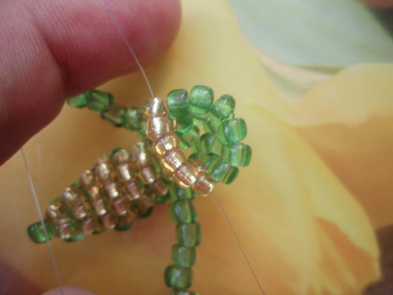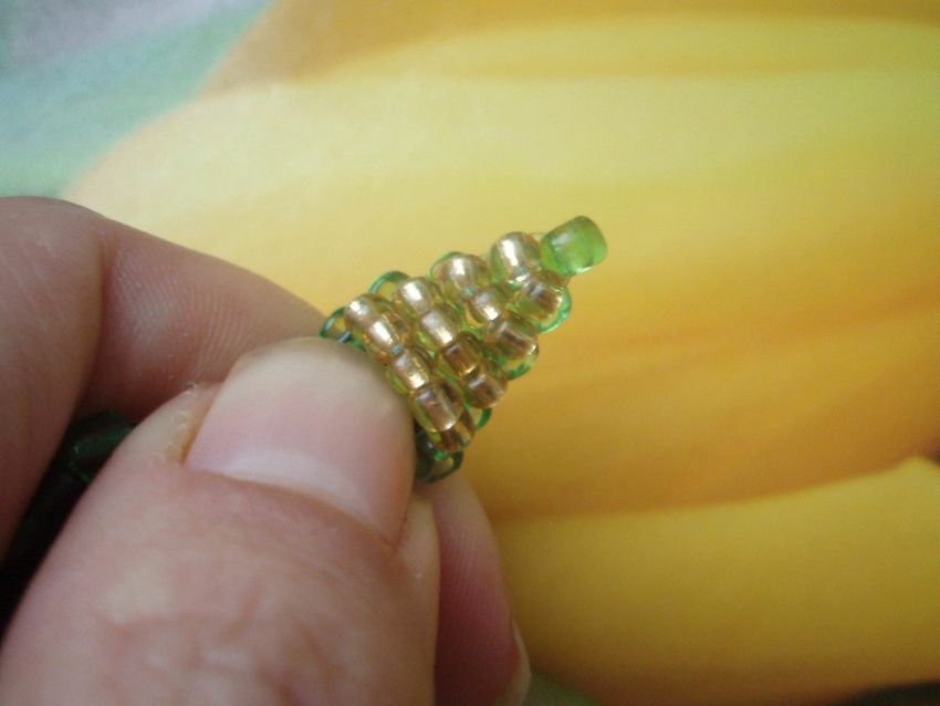 - Le schéma de tissage est utilisé : 3, 3, 4, 4, 5, 6, 7, 8, 9. Il est nécessaire d'alterner la couleur des perles. Le vert est remplacé par le jaune. Pour plus de commodité, on utilise un bâton ou une aiguille épaisse. Après avoir créé une bande de 4-5 éléments, elle est insérée et le tissage continue. Cela permet d'assembler une pièce régulière et de sécuriser sa forme.