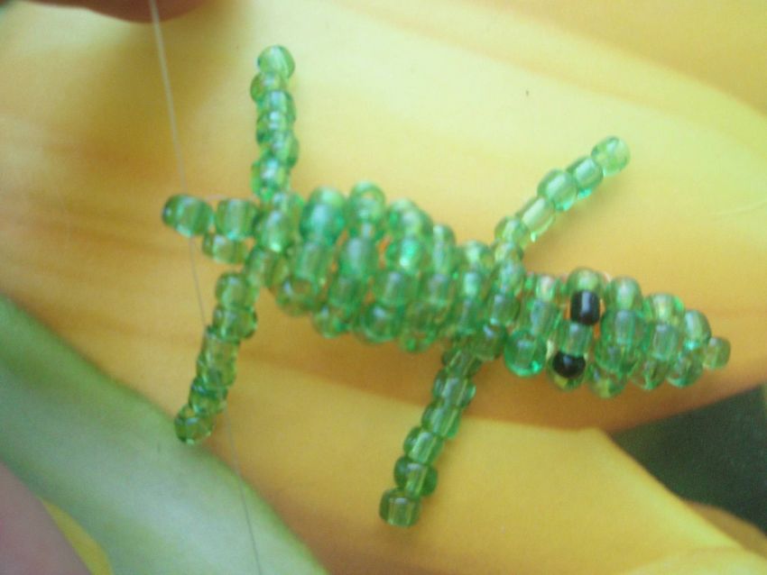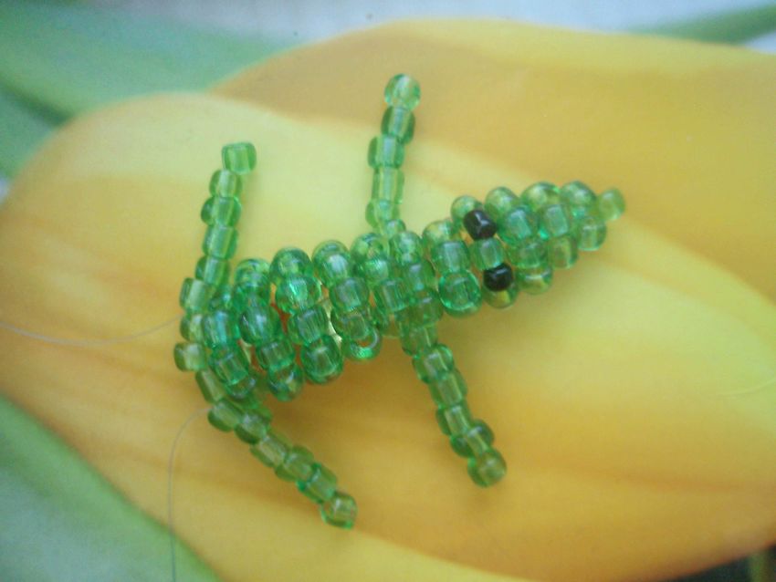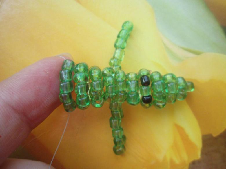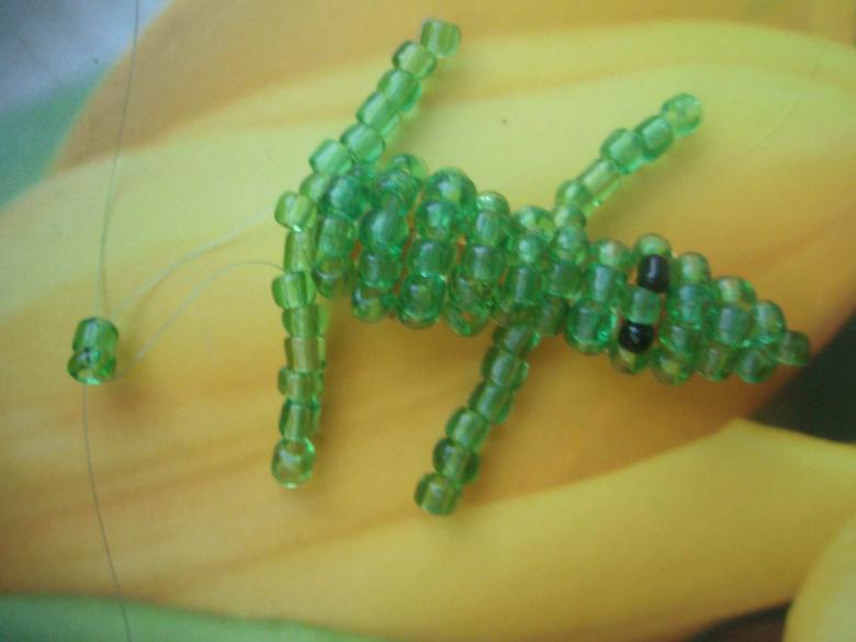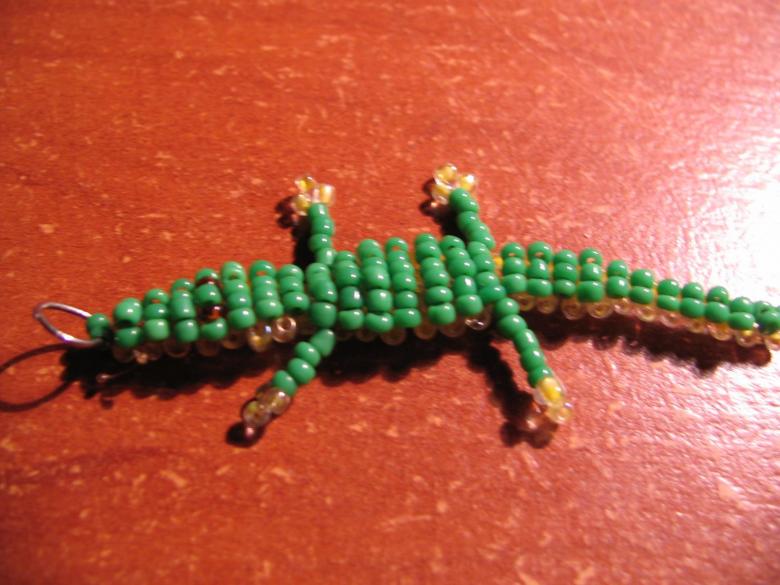 - Au 13ème rang, les pattes de crocodile sont créées. Cinq perles sont utilisées. Le fil de pêche est enfilé dans le trou de la dernière perle. Dans les 4 autres, il est inséré de l'autre côté. Le deuxième membre est créé de manière similaire. Mais le travail se fait sur le côté parallèle de l'artisanat.