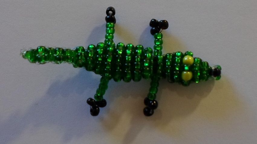 Il est souvent créé en combinant deux métiers plats. Cependant, un schéma complet de perles en crocodile tridimensionnel implique de faire le travail à partir de zéro, du début à la fin. Pour un artisanat sûr, il est préférable d'utiliser un fil de fer. Ce matériau maintiendra la forme. Avant de commencer, assurez-vous que les perles s'adaptent à la base.