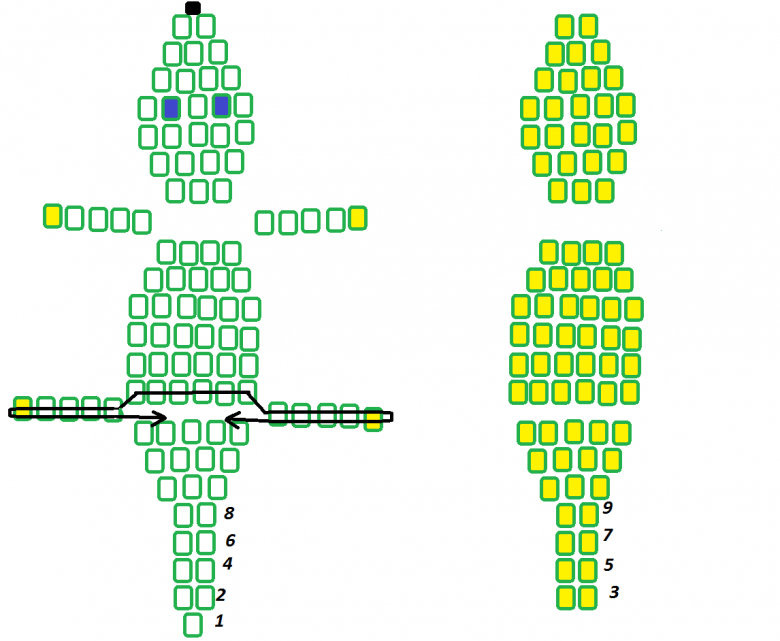 Vous devez d'abord apprendre le schéma de tissage des perles de crocodile, car sans cela, il est difficile, voire impossible, d'effectuer un travail de qualité. Vous pouvez voir des flèches indiquant le point de départ du tissage et la phase finale du travail.