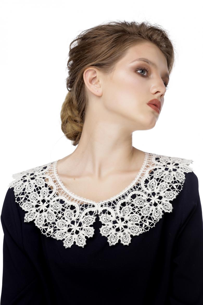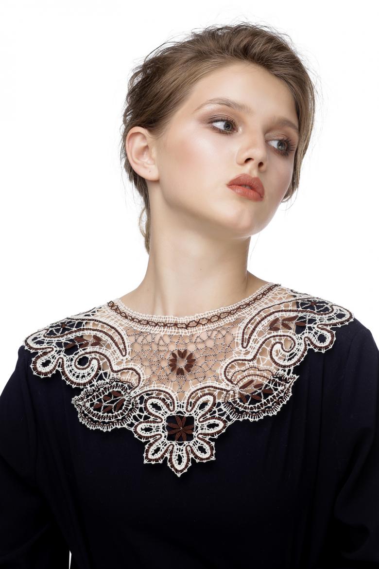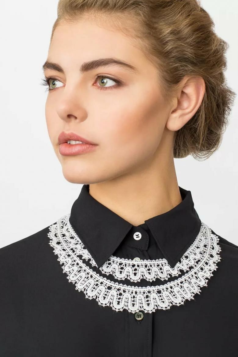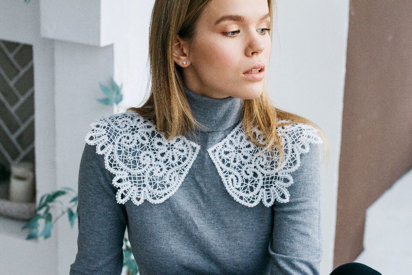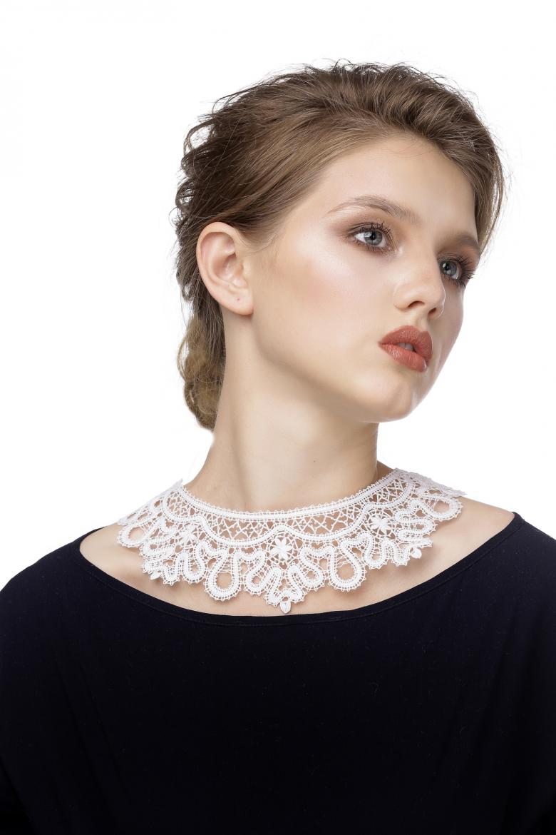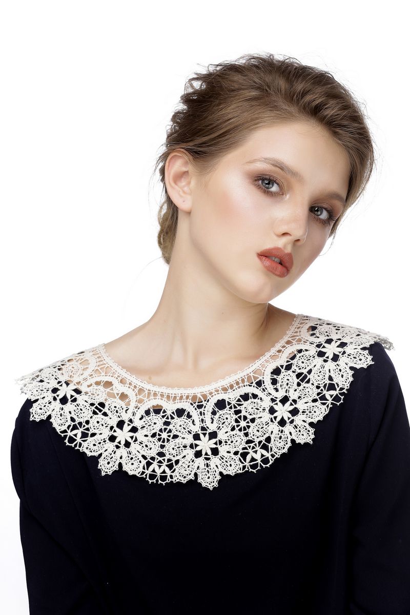Un col en dentelle est l'un des accessoires les plus insolites de la garde-robe d'une femme. Il peut être utilisé aussi bien avec des tenues de soirée qu'avec des tenues décontractées. Il rend toute tenue unique et gracieuse. On remarque que la dentelle la plus fine sur le col souligne la beauté de l'image et est très efficace.