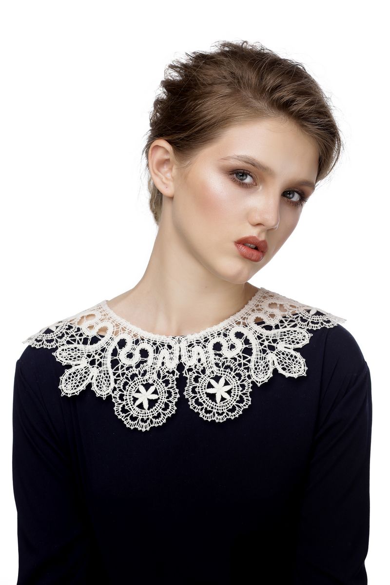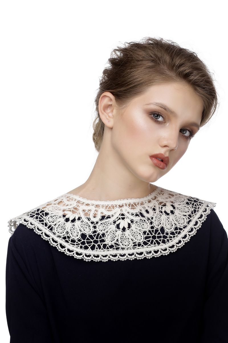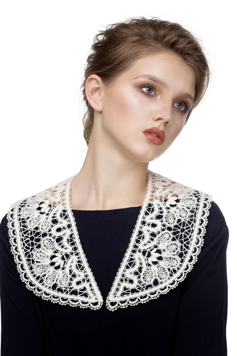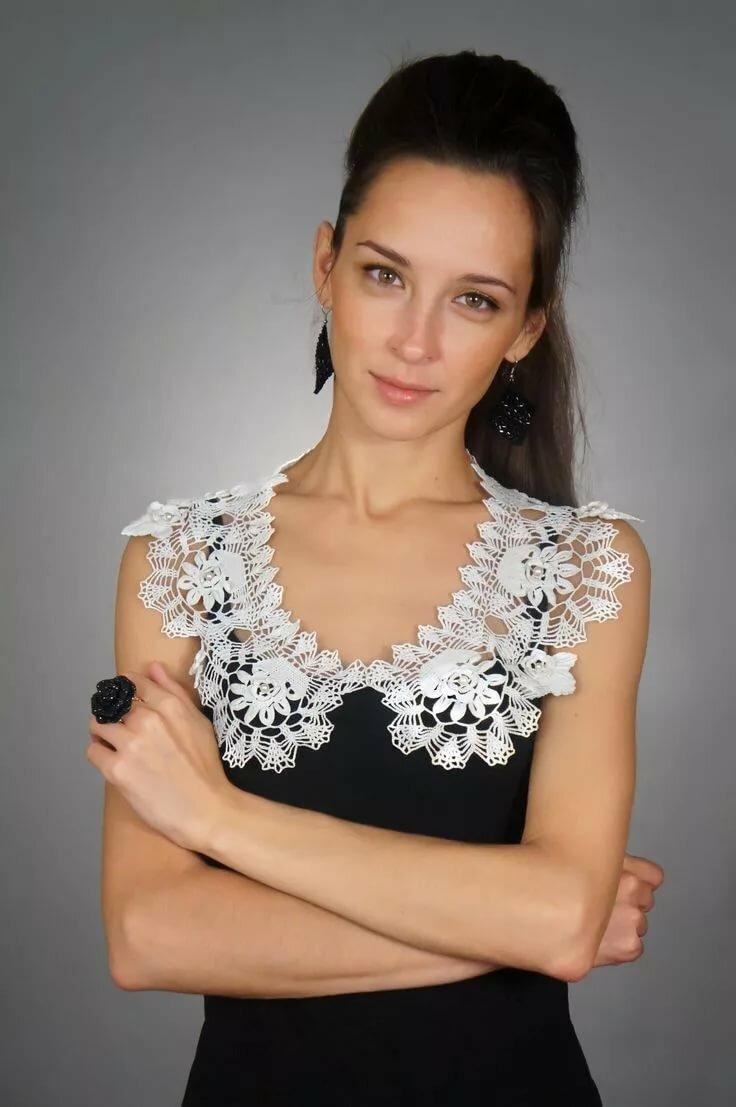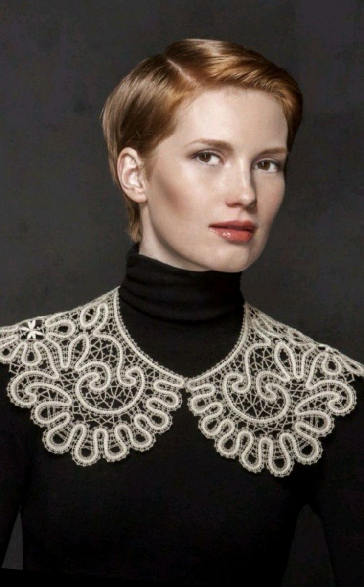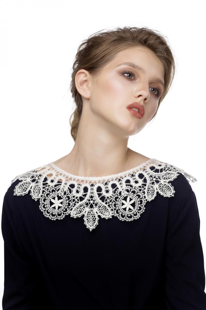 Un col en dentelle est l'un des accessoires les plus insolites de la garde-robe d'une femme. Il peut être utilisé aussi bien avec des tenues de soirée qu'avec des tenues décontractées. Il rend toute tenue unique et gracieuse. On remarque que la dentelle la plus fine sur le col souligne la beauté de l'image et est très efficace.