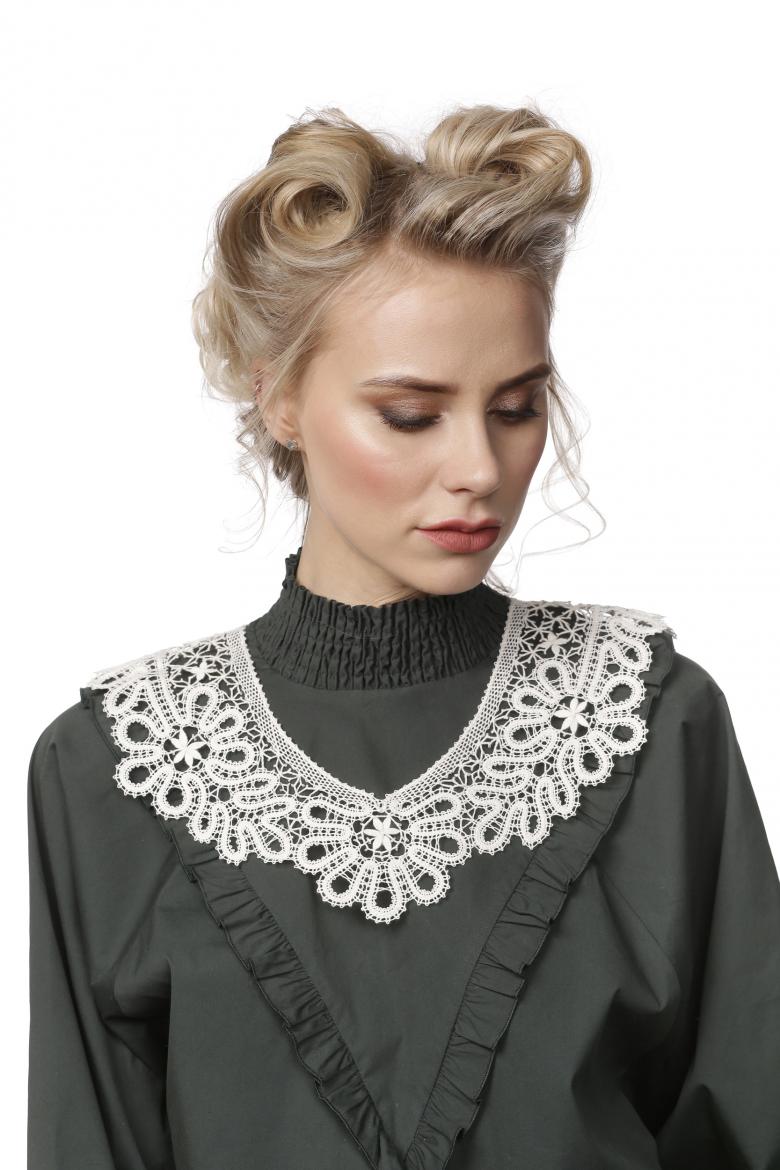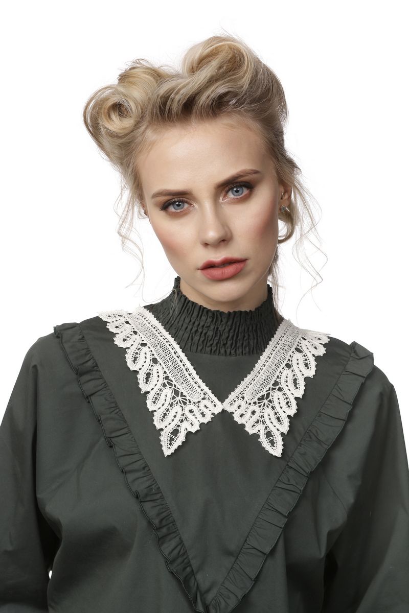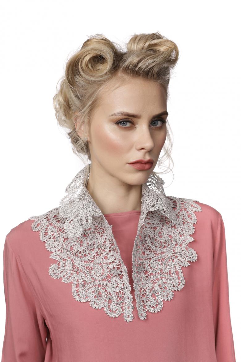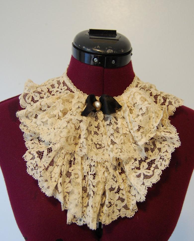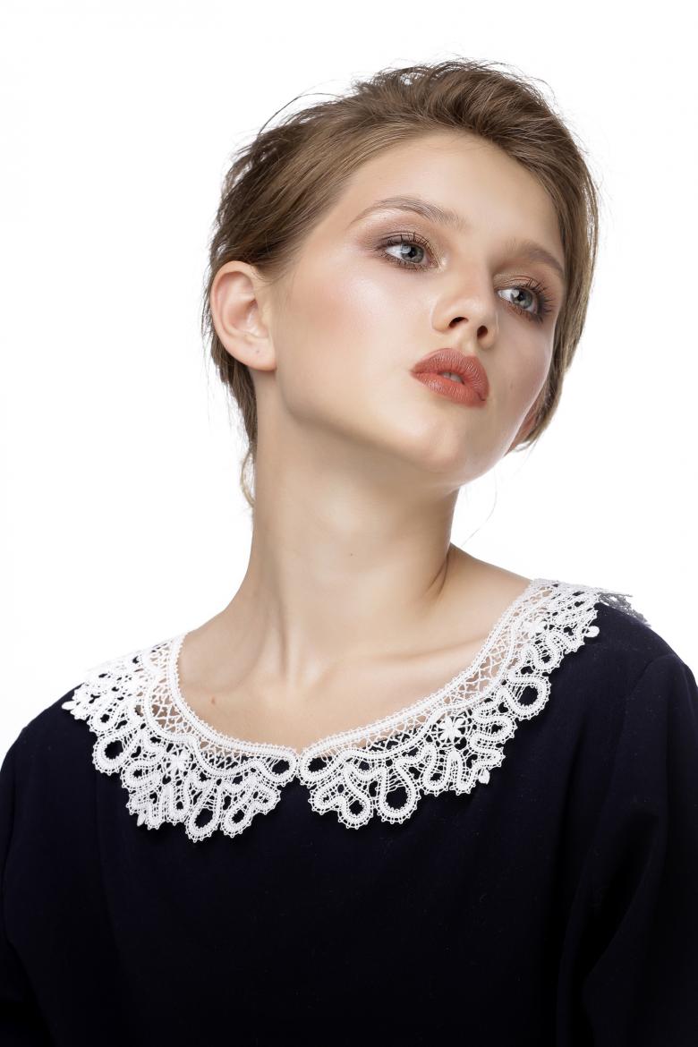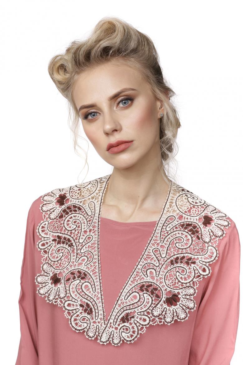 Un col en dentelle est l'un des accessoires les plus insolites de la garde-robe d'une femme. Il peut être utilisé aussi bien avec des tenues de soirée qu'avec des tenues décontractées. Il rend toute tenue unique et gracieuse. On remarque que la dentelle la plus fine sur le col souligne la beauté de l'image et est très efficace.
