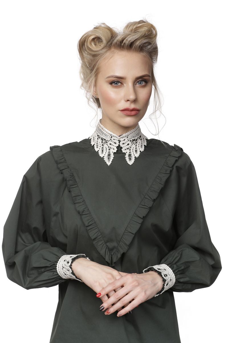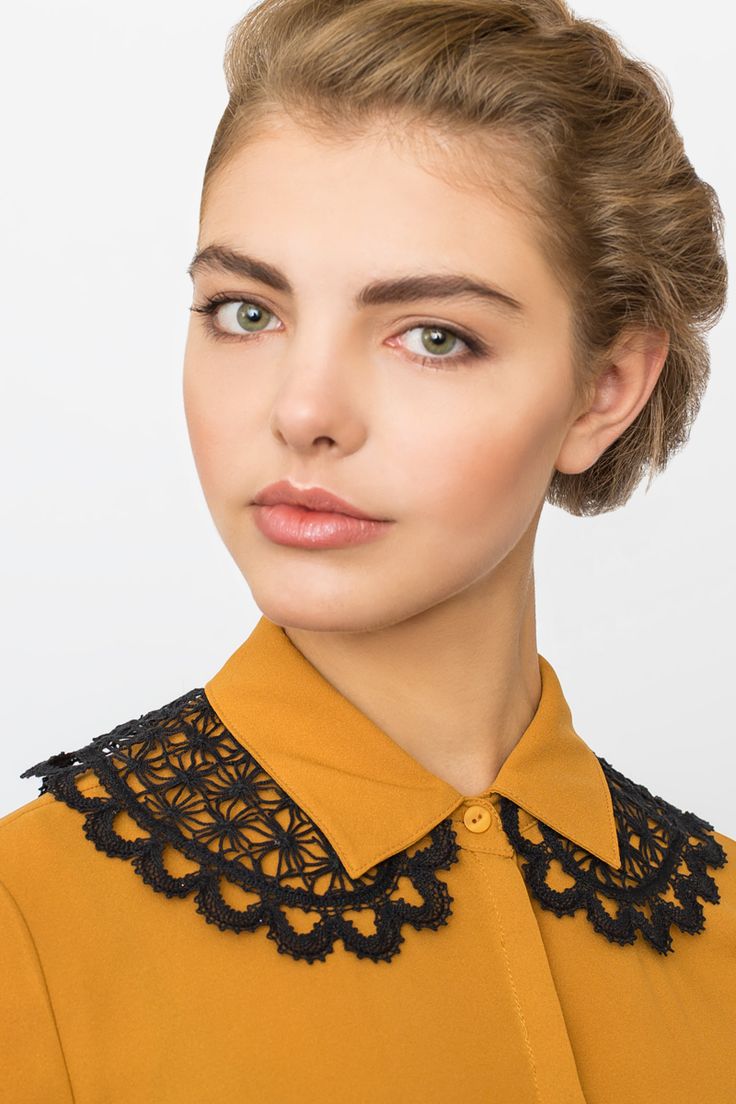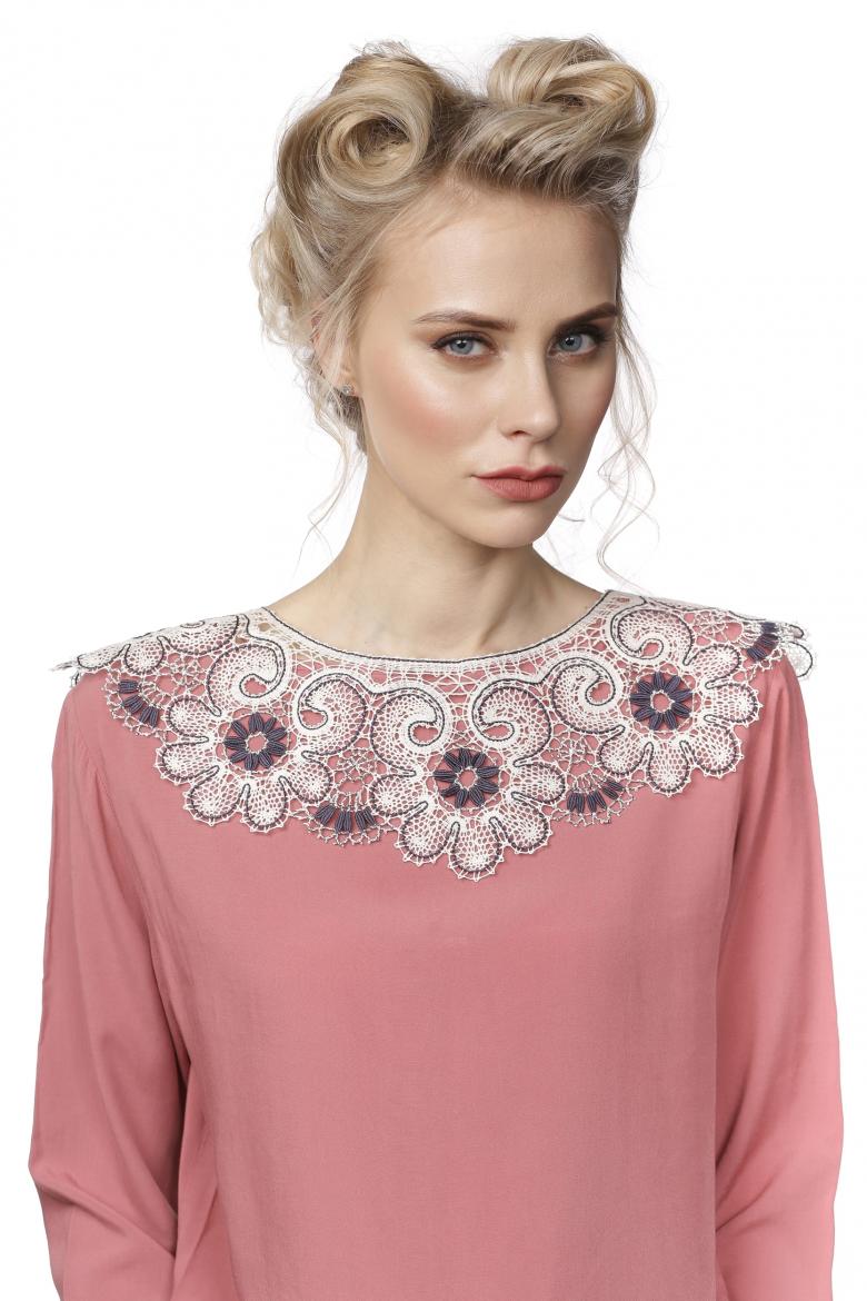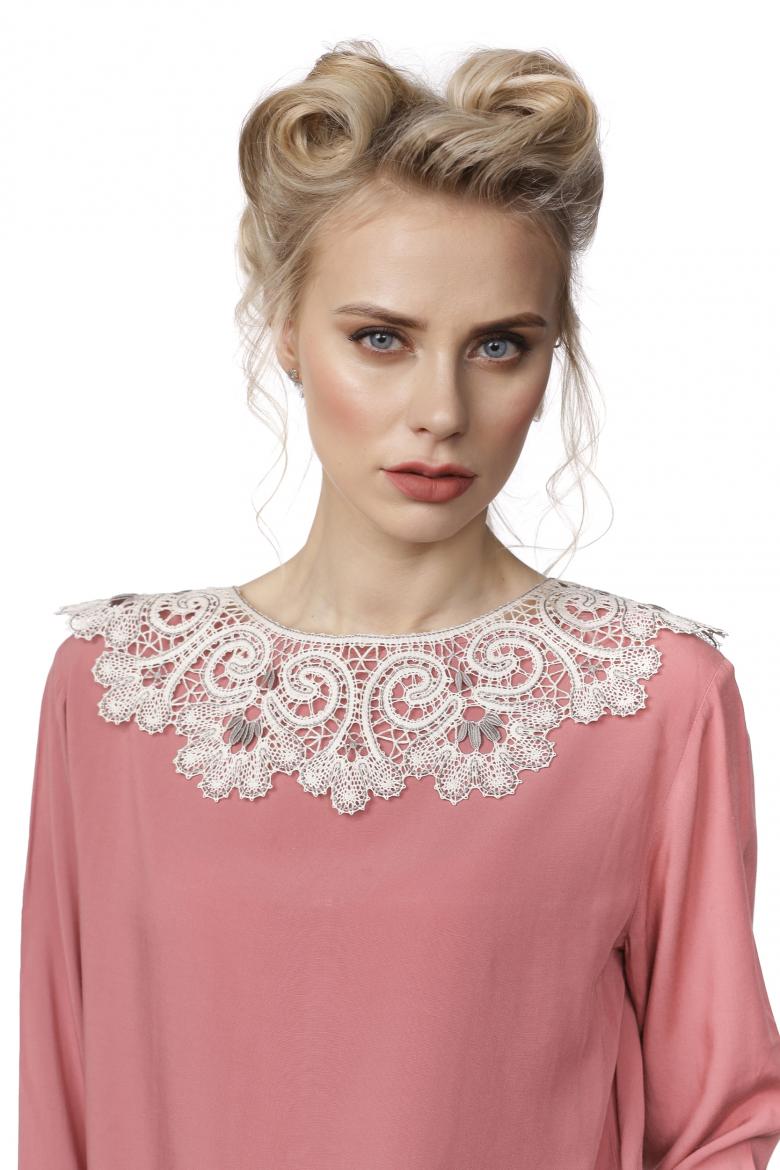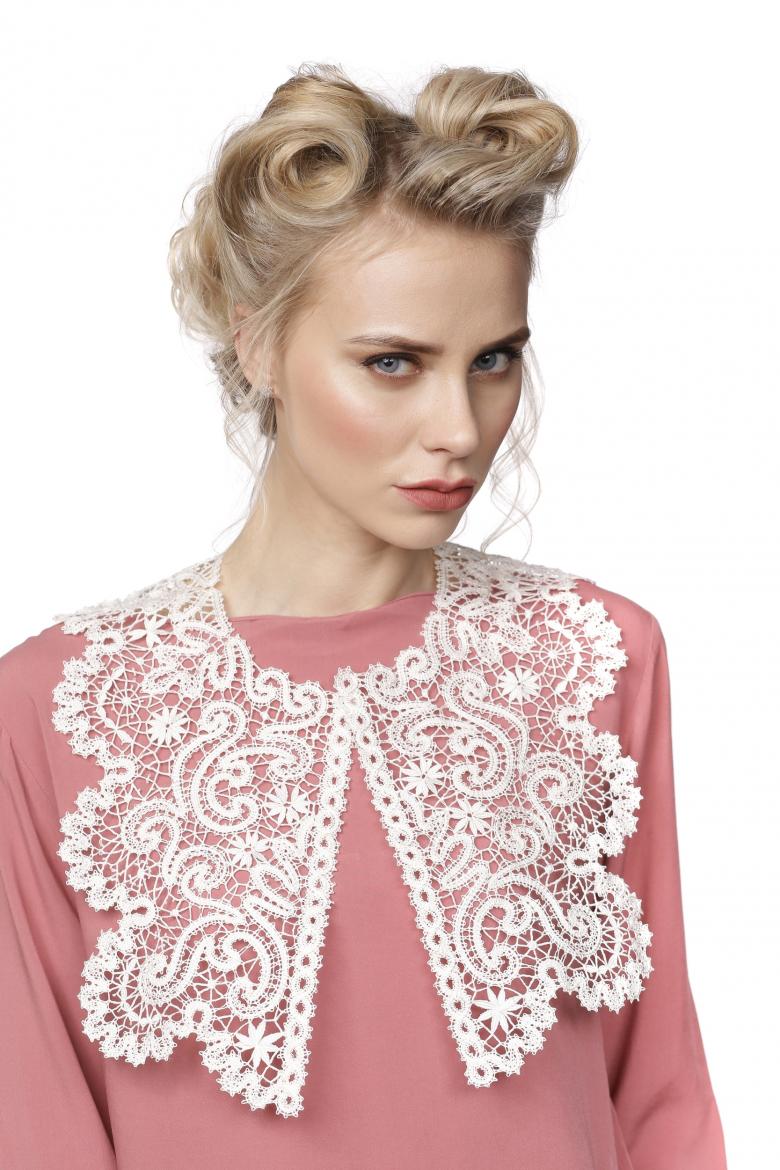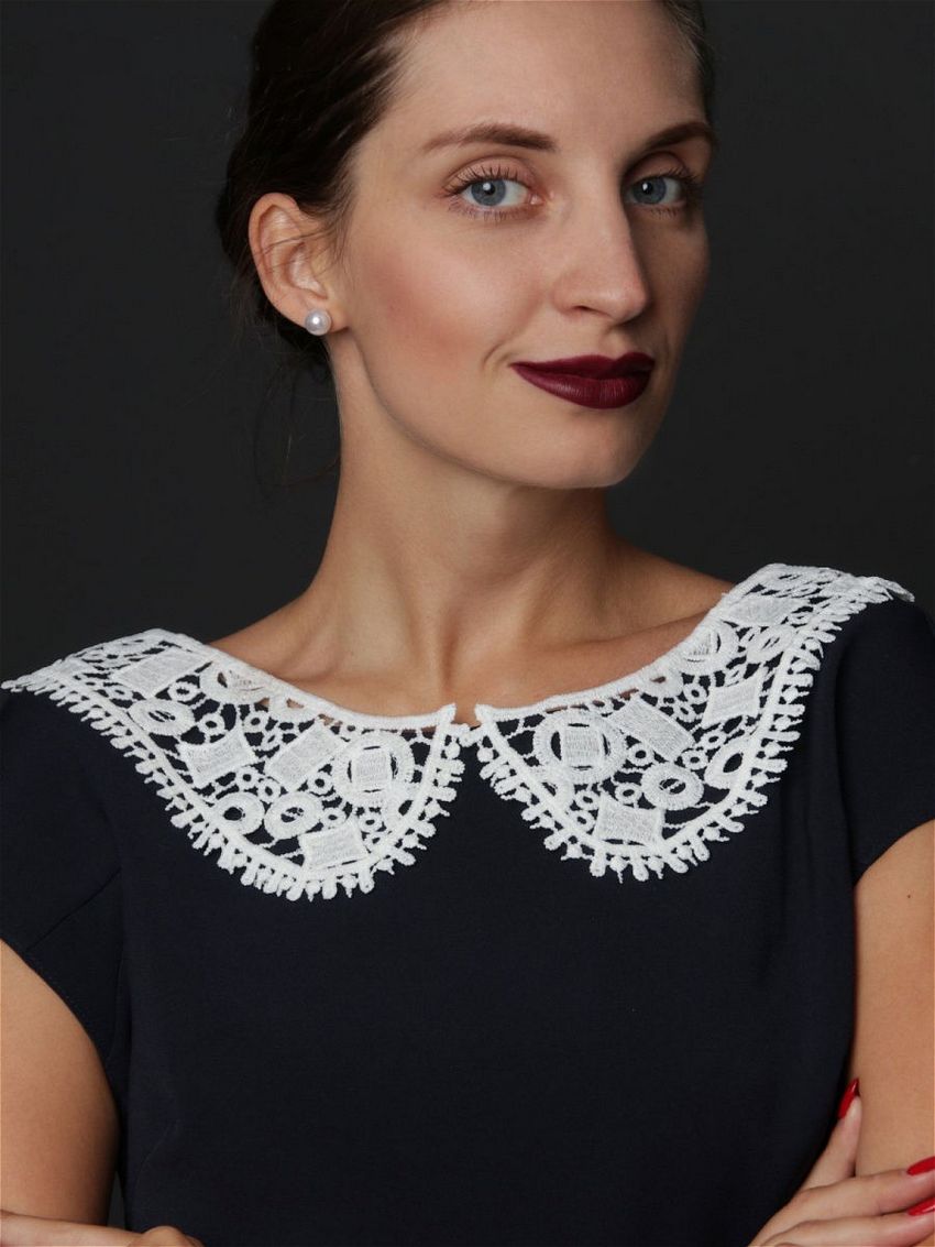 Un col en dentelle est l'un des accessoires les plus insolites de la garde-robe d'une femme. Il peut être utilisé aussi bien avec des tenues de soirée qu'avec des tenues décontractées. Il rend toute tenue unique et gracieuse. On remarque que la dentelle la plus fine sur le col souligne la beauté de l'image et est très efficace.