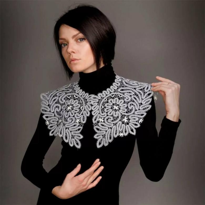 Les cols en dentelle amovibles sont appropriés pour être combinés avec n'importe quel vêtement - robe, pull, blouse. Ils peuvent être facilement achetés dans les magasins de nos jours. Le travail de l'auteur semble plus sophistiqué. L'avantage d'un accessoire amovible est que vous pouvez l'enlever pour le laver plus tard.