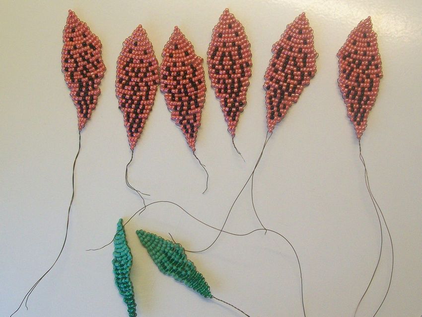 Tressé par le principe de la feuille. La rangée centrale est enfilée de 40 perles en verre vert foncé. Des rangées de paires sont formées. Un total de 4 paires est nécessaire. La cinquième bande est utilisée comme bande extérieure. Il est fixé sous le niveau supérieur pour constituer une version pointue de la pointe. La longueur des feuilles est d'environ 5 cm. Le rameau coloré est composé de 7 à 9 feuilles.