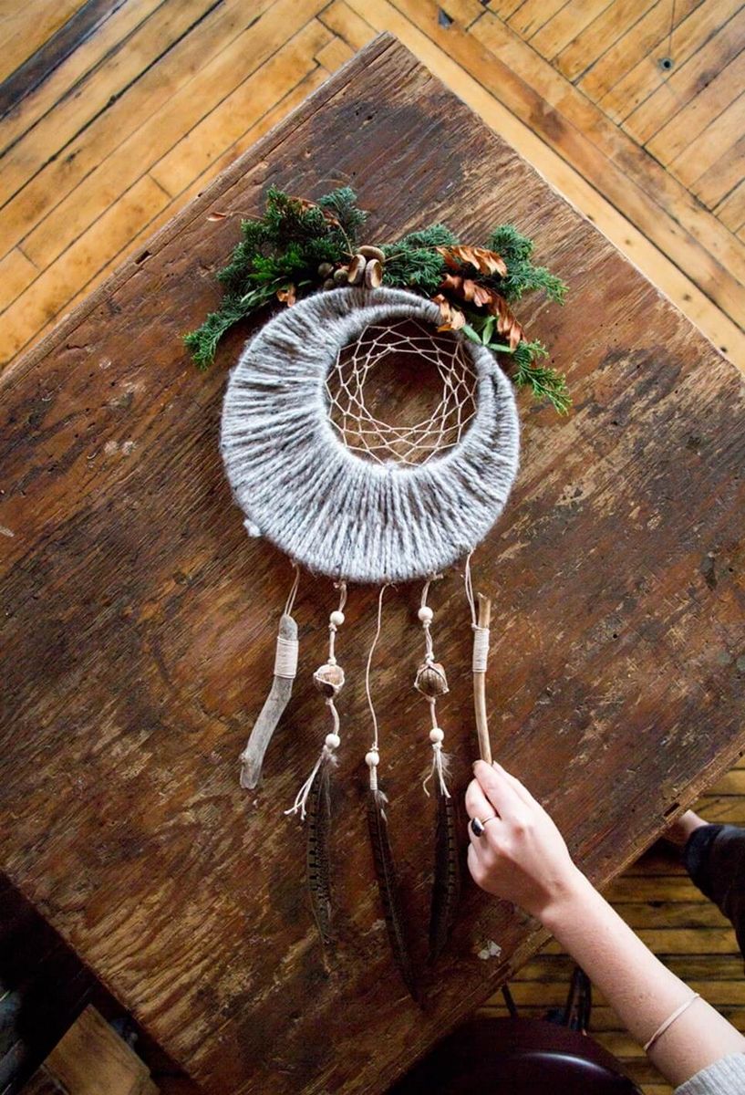 Il est également possible d'utiliser des pièces tricotées, crochetées ou non pour créer un attrape-rêves, ajouter du macramé, des morceaux de tissu à tisser. Fixez les nœuds éventuels avec de la colle, en utilisant un pistolet chauffant en silicone.