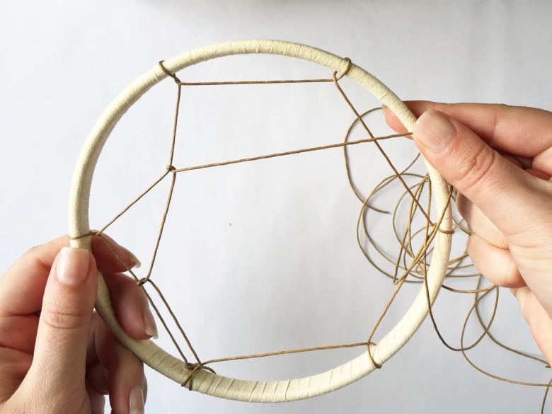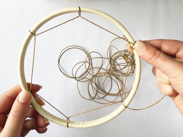 Lorsque le cercle est prêt, vous devez laisser environ 20 centimètres de fil pour la suspension. Mesurez ensuite la circonférence à l'aide d'un mètre ruban et divisez-la par le nombre de points de fixation du fil du premier rang au cercle. Ici, tout dépend des priorités personnelles, du sens que l'on donne au chiffre choisi.