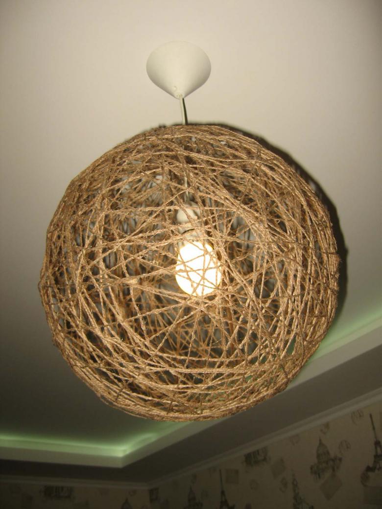 Cet abat-jour réalisé de leurs propres mains pour un lustre est extrêmement facile à réaliser et ne nécessite pas de compétences particulières. Il peut donc toujours servir de base à ceux qui n'ont pas d'expérience de la maîtrise pour concevoir des choses de leurs propres mains. Dans ce cas, vous pouvez changer la couleur du fil dans les couches, pour obtenir un effet particulier.
