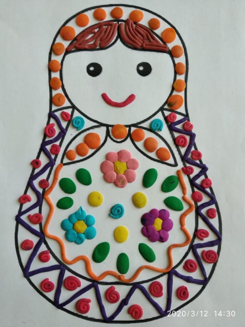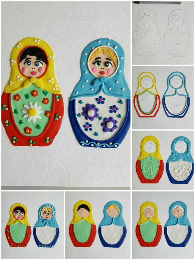 Tout est très simple. Nous fabriquons la tête et le corps des poupées matryoshka, les yeux, la bouche, attachés aux pois du corps en plasticine et mettons un foulard.